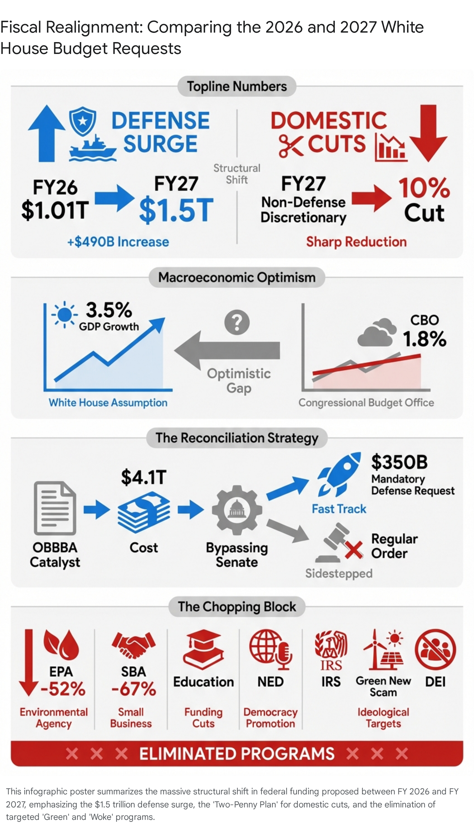 The Presidential Budget Requests for FY 2026 and FY 2027 are best understood not as traditional governing documents aimed at achieving bipartisan consensus, but as radical, uncompromising blueprints for structurally reshaping the American state. By combining historic, deficit-financed tax cuts (via the OBBBA) with an unprecedented $1.5 trillion military and border security surge, the administration has deliberately locked the federal government into a structural deficit trajectory that simply cannot be mathematically resolved by its proposed domestic cuts alone.