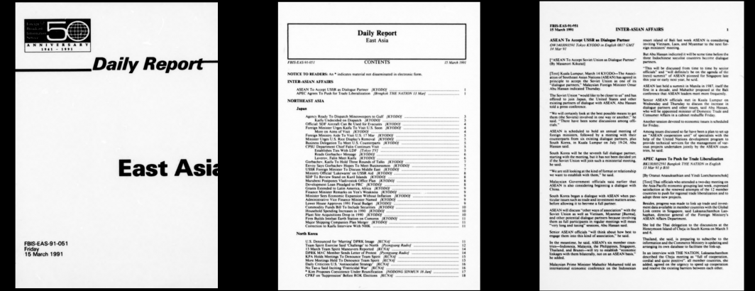 Earlier this year the Internet Archive was formally designated as a US Federal Depository Library. It preserves a massive archive of digitized US Government documents, amongst which is a large archive of 16,231 scanned Foreign Broadcast Information Service (FBIS) reports totaling more than 800,000 pages. (Read more about FBIS' history and mission). Like most government documents, these reports were produced over decades for human consumption and contain complex formatting, headers, footers, inconsistent structuring, varying column counts and myriad other challenges that make them difficult to format for modern search and analysis by scholars. Just recognizing the boundary of a story, following it across columns, reformatting it, removing errant headers and footers and parsing out the various source details from its citation line is extremely complex and error-prone. Can Gemini do all of this for us? Let's take a sample 1991 FBIS report scanned from microform and ask Gemini 3 Pro, Gemini 3 Flash, Gemini 2.5 Pro and Gemini 2.5 Flash Thinking and Non-Thinking to parse and reformat it into machine-readable JSON records with all of the key source metadata extracted and structured, ready for import directly into a search index or for data analysis by scholars.