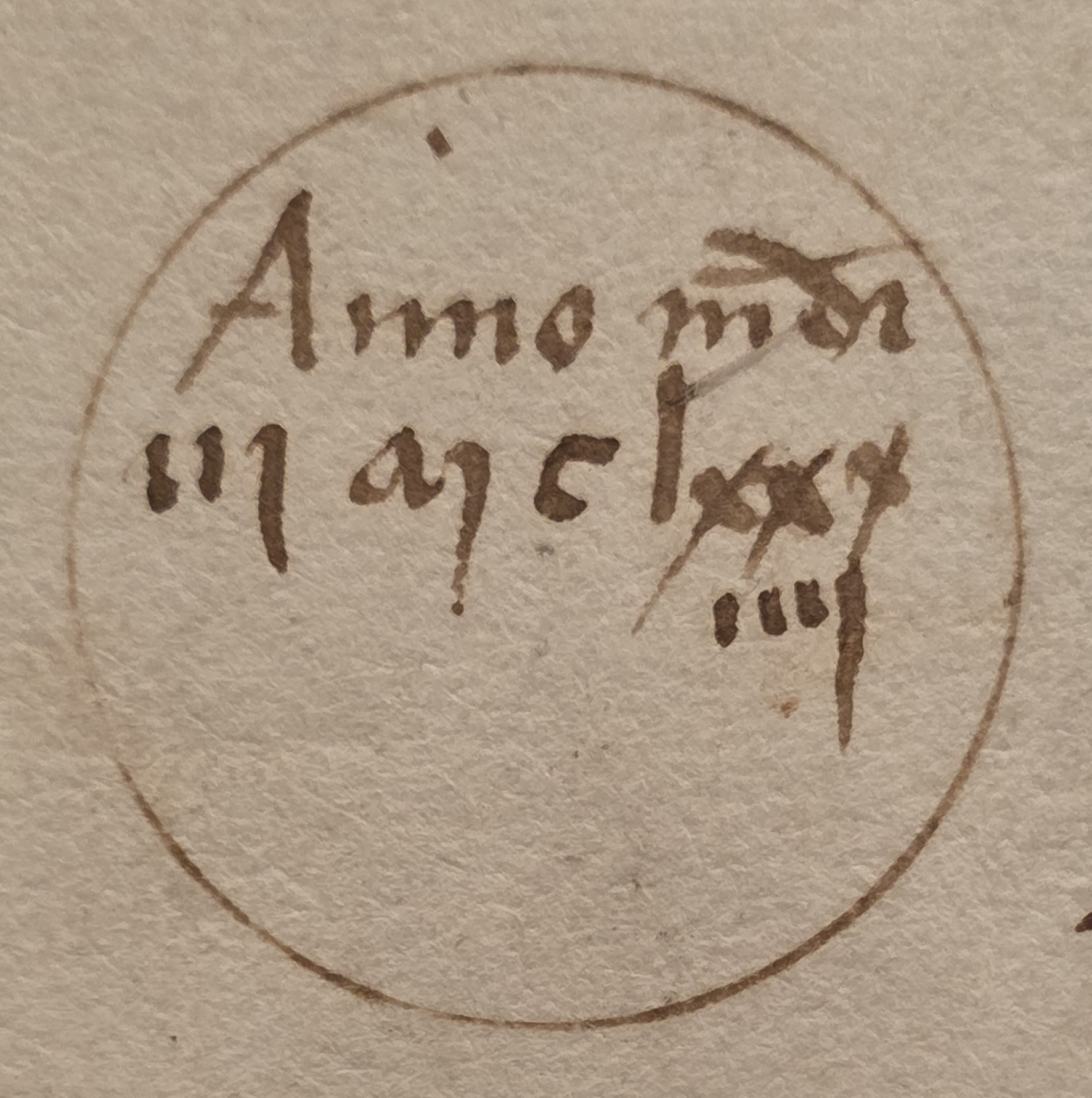 I'm starting to get a clear picture of the script's characteristics. I've noted the brown/sepia ink, hinting at iron-gall. It's a practiced yet informal hand, not a formal book hand but also not a frantic scrawl. My initial inspection reveals freehand circles drawn with a quill, indicating a casual annotation. Now, I'm focusing on a letter-by-letter analysis to define the script type as likely transitional, with Gothic Cursive influences merging into Humanist Cursive elements, pointing toward the 16th century.