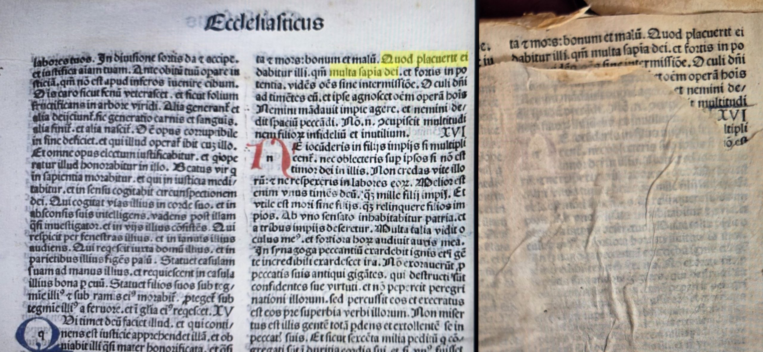 Older books can offer fascinating history lessons as you dig into their layers (literally) like an archaeological dig. Once upon a time it was common to bind or rebind books by gluing together stacks of pages from older books to make a thick sheet to act as the cover boards over which the vellum was wrapped. This "binding waste" was typically taken from older books and can yield fascinating stories. At right is the inside cover of a 1583 Aldine edition of Cicero's works. A fracture in the vellum adhesion was slowly and gently worked back to reveal a sliver of the text underneath near the top of the inside cover. Using Gemini 3.0 as a seed and some additional manual research, this binding waste page was at long last tracked down to its original source: the 1487 incunable printing of the Biblia Latina by Georgius Arrivabene in Venice ("Explicit biblia Venetiis impressa per Georgium de riuabenis mantuanum al's parente"). There are at least 40 pages of the 1487 Arrivabene Bible glued together across the front and back covers of this Cicero. This particular page is from The Book of Ecclesiasticus (Sirach), end of Chapter 15 / start of Chapter 16 – notice how the page at right matches exactly the righthand column of the digitized copy of the Arrivabene at left. Interestingly, we had long been unable to trace this provenance using previous LMMs due to the commonality of the visible phrases, but Gemini 3.0 was able to recognize that this specific set of phrases in this specific order and column structure were unique to this specific Bible.