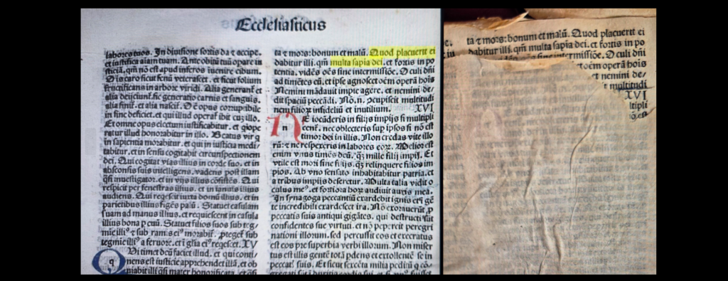 Older books can offer fascinating history lessons as you dig into their layers (literally) like an archaeological dig. Once upon a time it was common to bind or rebind books by gluing together stacks of pages from older books to make a thick sheet to act as the cover boards over which the vellum was wrapped. This "binding waste" was typically taken from older books and can yield fascinating stories. At right is the inside cover of a 1583 Aldine edition of Cicero's works. A fracture in the vellum adhesion was slowly and gently worked back to reveal a sliver of the text underneath near the top of the inside cover. Using Gemini 3.0 as a seed and some additional manual research, this binding waste page was at long last tracked down to its original source: the 1487 incunable printing of the Biblia Latina by Georgius Arrivabene in Venice ("Explicit biblia Venetiis impressa per Georgium de riuabenis mantuanum al's parente"). There are at least 40 pages of the 1487 Arrivabene Bible glued together across the front and back covers of this Cicero. This particular page is from The Book of Ecclesiasticus (Sirach), end of Chapter 15 / start of Chapter 16 – notice how the page at right matches exactly the righthand column of the digitized copy of the Arrivabene at left. Interestingly, we had long been unable to trace this provenance using previous LMMs due to the commonality of the visible phrases, but Gemini 3.0 was able to recognize that this specific set of phrases in this specific order and column structure were unique to this specific Bible.