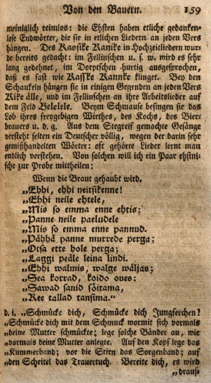 Of Rassike Rannike in wedding songs mention has already been made: in the Fellin dialect, etc., it is drawn out very long; in the Dorpat dialect it is pronounced briskly, so that it almost sounds like Rasske Rannke. On the swings, in some regions, they append Rike ålle to every verse, and in the Fellin dialect to their work songs in the field they add Belelele. At feasts they sing the praises of their generous host, of the cook, of the beer brewer, and the like. Songs made extemporaneously are rarely fully understood by a German, because of the very badly mangled words used in them; songs that are often heard one eventually learns to understand. Of such songs I will communicate a couple of Estonian ones as a sample: When the bride is veiled. bbi, ehbi neitsikenne! Ehhi neile ehtele, „Mis so emma enne ehtis; „Panne neile paeludele „Mis so emma enne pannud. „Pabha panne mutrede perga; „Orsa ette bole perga; „Laggi pedle leina lindi. „Ebhi walmis, walge wåljas; „Sea korrad, koido oues: „Sawad sanid sõitama, „Ree tallad tansima." That is: “Adorn yourself, adorn yourself, little maiden! Adorn yourself with the ornaments with which your mother once adorned herself; put on the ribbons that your mother once put on. Place on your head the band of sorrow; before your forehead the band of care; upon the crown the cloth of mourning. Prepare yourself, it will be bright outside; set things in order, dawn is in the yard: the words will begin to ride, the sled-runners to dance.”