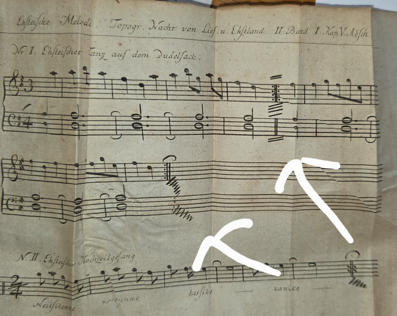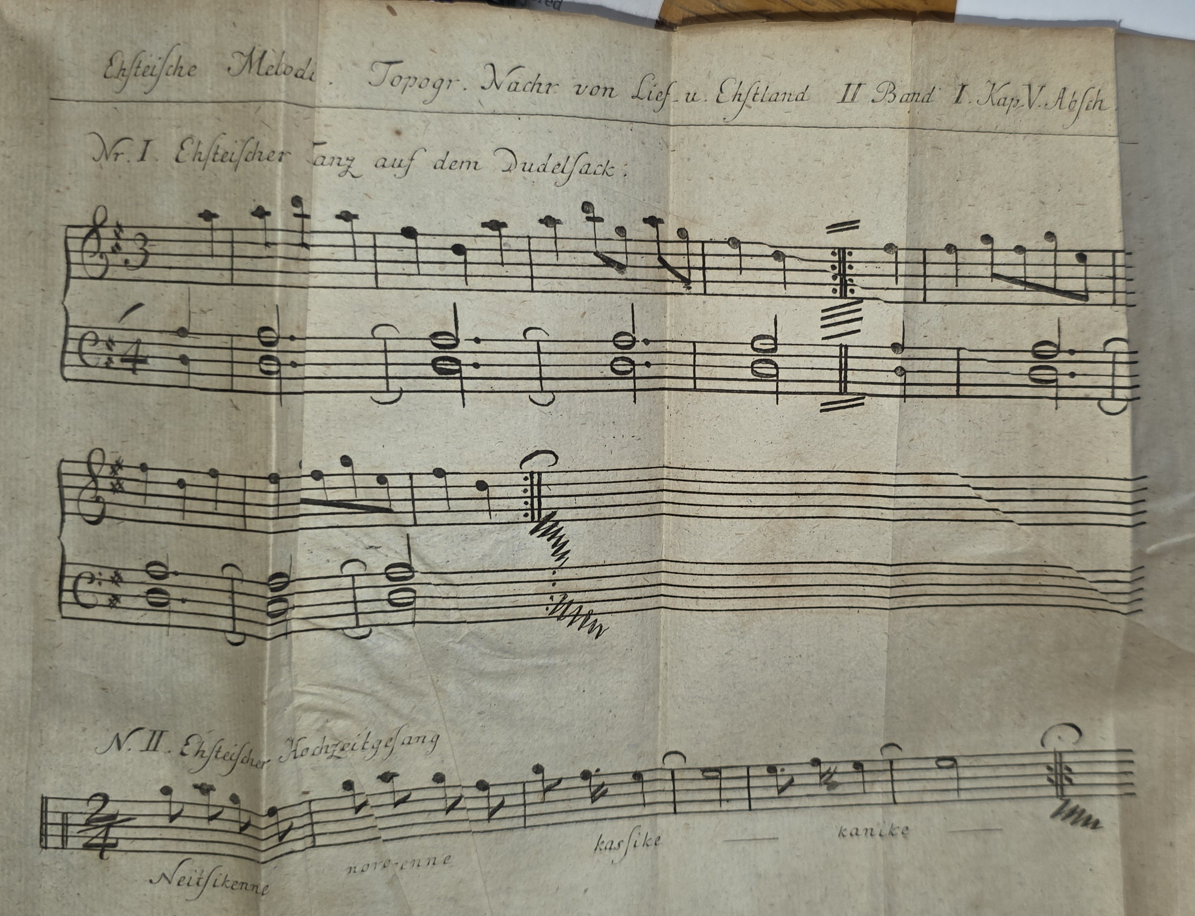 Header Transcription: Ehstnische Melod. Topogr. Nachr von Lief u. Ehstland II Band I. Kap V. Absch Translation: Estonian Melodies. Topographical Accounts of Livonia and Estonia, Volume 2, Chapter 1, Section 5. Piece No. I Transcription: Nr. I. Ehstnischer Tanz auf dem Dudelsack. Translation: No. I. Estonian Dance on the Bagpipe. Piece No. II Transcription: N. II. Ehstnischer Hochzeitgesang Translation: No. II. Estonian Wedding Song. Lyrics (Bottom) Transcription: Neitsikenne noro-enne kassike kanike Translation: (Estonian folk lyrics) "Little maiden, young one, kitten, chick."