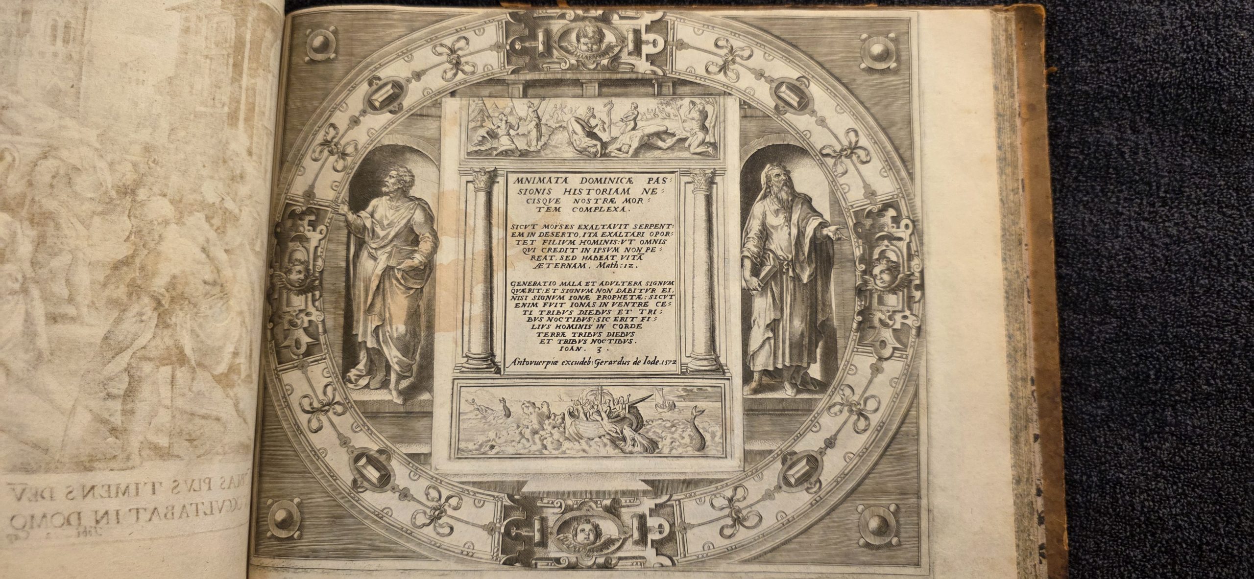De. Passione Domini On the Passion of the Lord. fo. 16 MNIMATA DOMINICAE PASSIONIS HISTORIAM NECISQVE NOSTRAE MORTEM COMPLEXA. SICVT MOYSES EXALTAVIT SERPENTEM IN DESERTO, ITA EXALTARI OPORTET FILIVM HOMINIS: VT OMNIS QVI CREDIT IN IPSVM NON PEREAT, SED HABEAT VITAM AETERNAM. Math: 12. GENERATIO MALA ET ADVLTERA SIGNVM QVAERIT: ET SIGNVM NON DABITVR EI, NISI SIGNVM IONAE PROPHETAE: SICVT ENIM FVIT IONAS IN VENTRE CETI TRIBVS DIEBVS ET TRIBVS NOCTIBVS: SIC ERIT FILIVS HOMINIS IN CORDE TERRAE TRIBVS DIEBVS ET TRIBVS NOCTIBVS. IOAN. 3. Antvuerpiae excudeb: Gerardus de Iode. 1572 Memorials embracing the history of the Lord's passion and the death of our slaying. As Moses lifted up the serpent in the desert, so must the Son of Man be lifted up: that everyone who believes in him may not perish, but may have eternal life. Matt: 12. An evil and adulterous generation seeks a sign: and a sign will not be given to it, except the sign of Jonah the prophet: for as Jonah was in the belly of the whale three days and three nights: so will the Son of Man be in the heart of the earth three days and three nights. John 3. Antwerp, published by Gerard de Jode, 1572. Gerardus de Iode