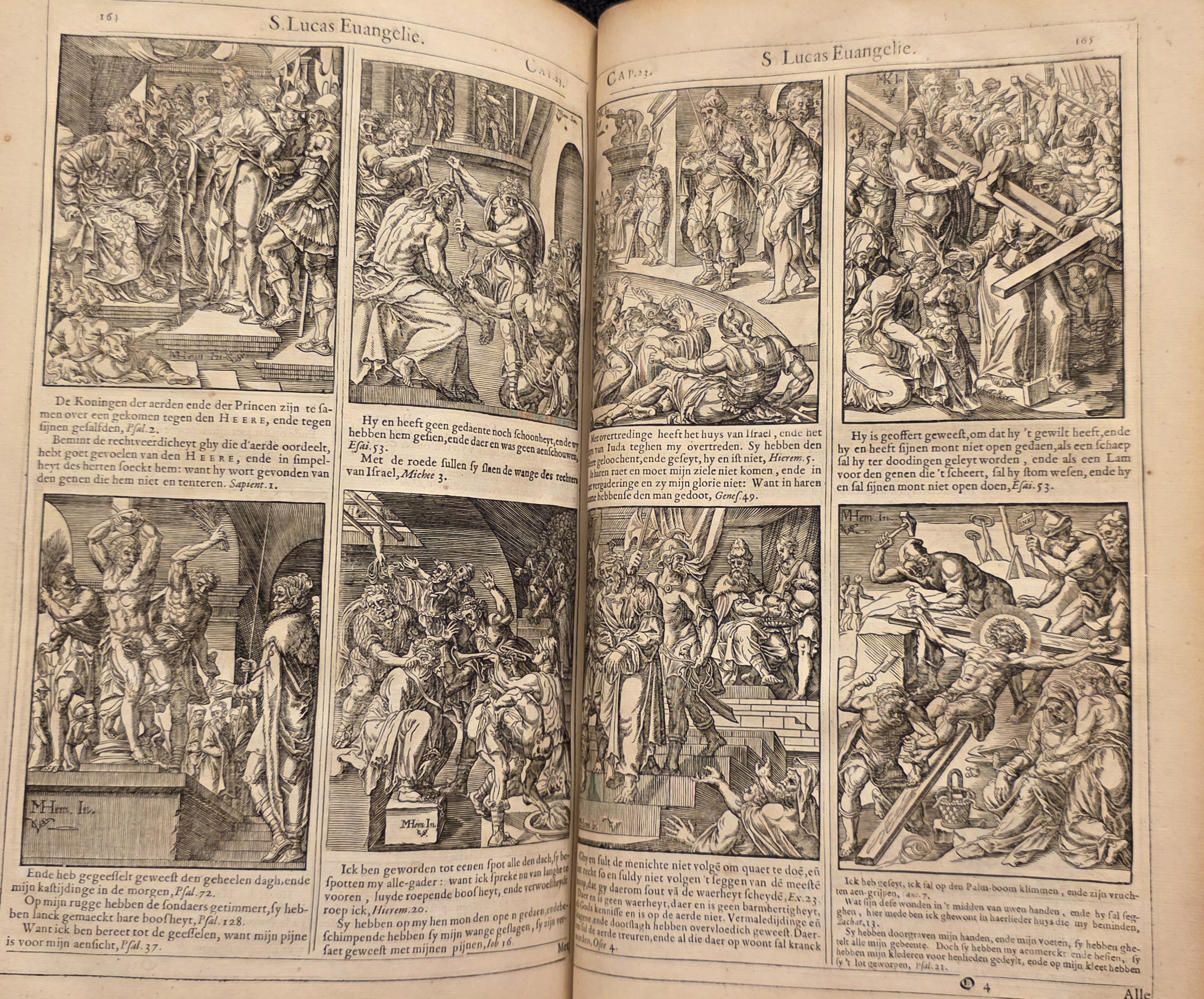 Publishers of these 17th-century Bibles often mixed and matched print series to get enough images to fill the book. Van Sichem copied works by several artists (including Dürer, Goltzius, and Maarten de Vos). It is theoretically possible that "MK" refers to a lesser-known contemporary of Heemskerck, but given the seamless stylistic unity across all six panels on these pages, it is overwhelmingly likely they were all designed by Maarten van Heemskerck.