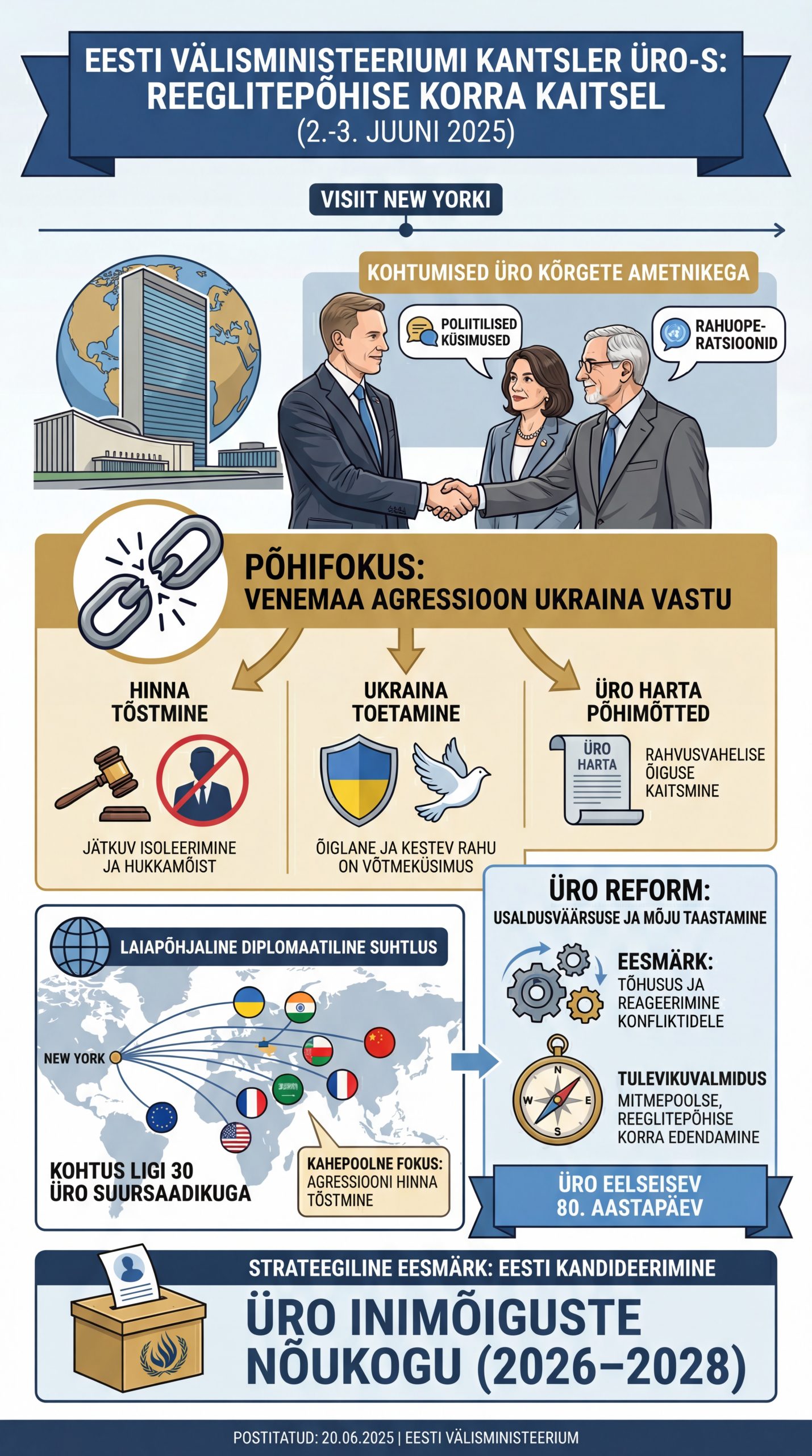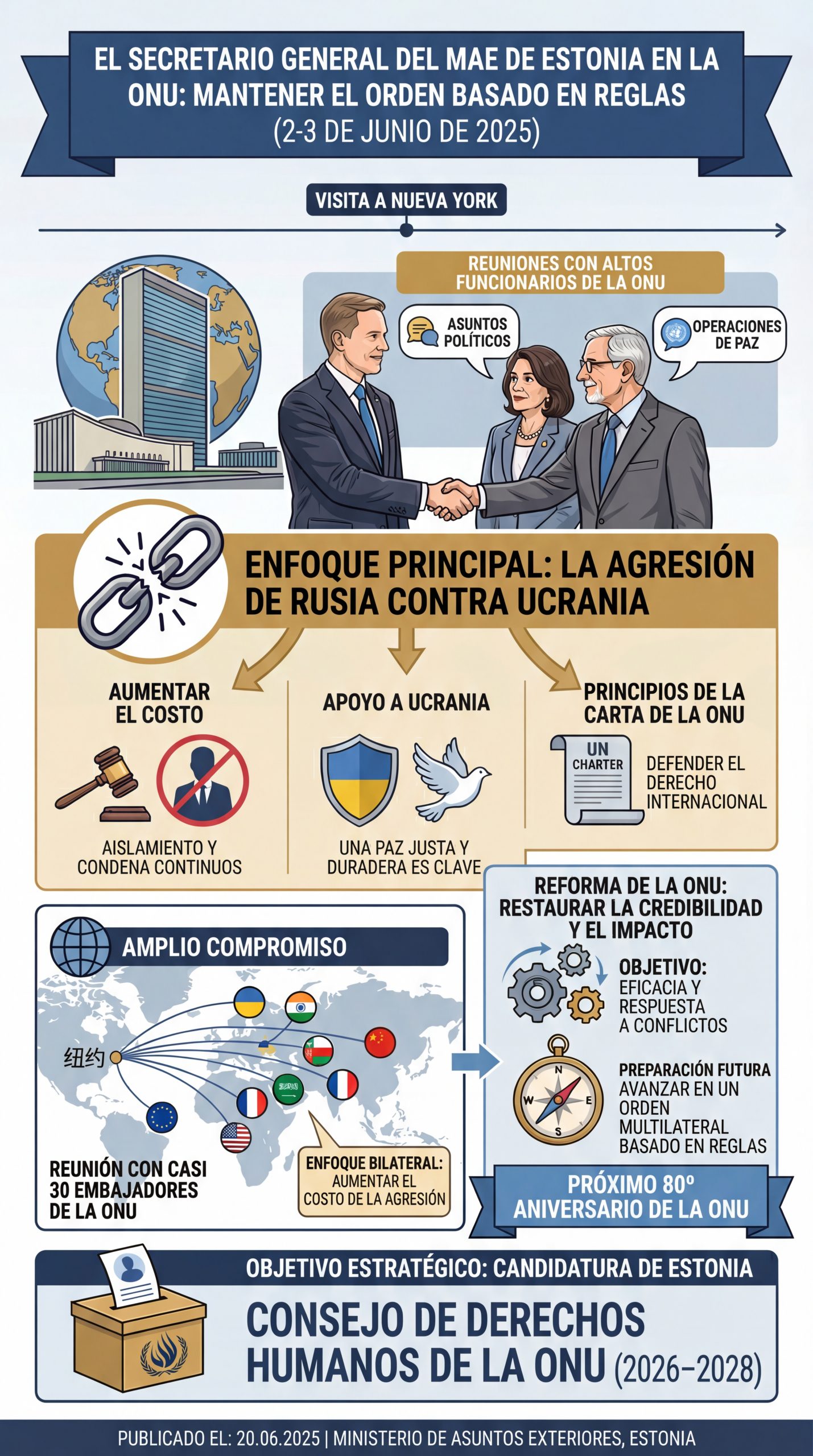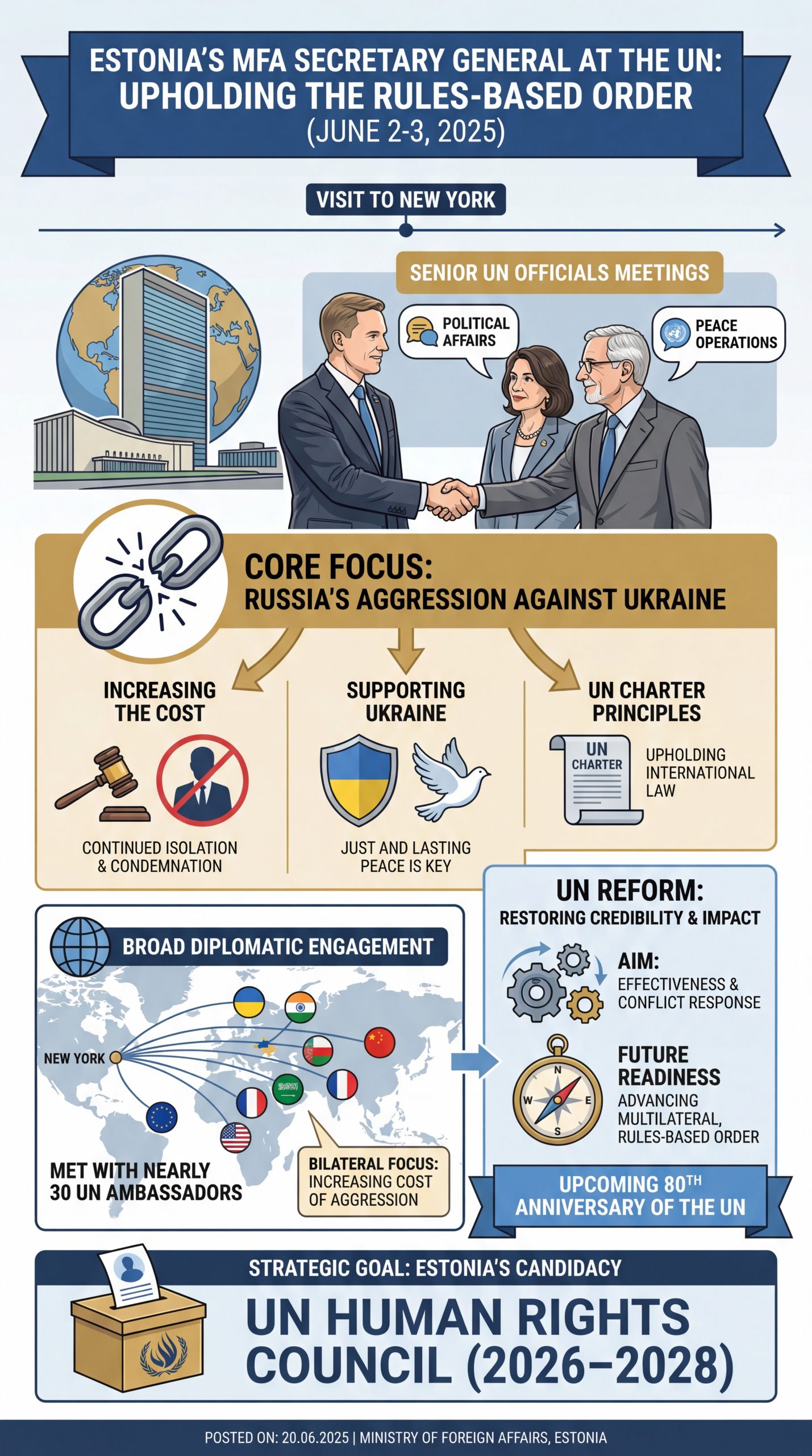 Let's start with The Secretary General of the Ministry of Foreign Affairs, Jonatan Vseviov, met with senior UN officials in New York. We'll use this prompt to visualize the press release as an infographic using Nano Banana Pro and use 4K resolution to maximize text clarity.