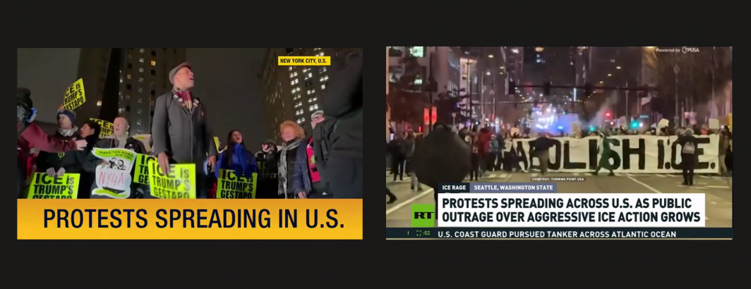 Iranian & Russian Television Covers ICE Protests January 8, 2026 Iranian and Russian television coverage has been covering ICE protests in the US today. Watch Example Iranian Clip. Watch Example Russian Clip.