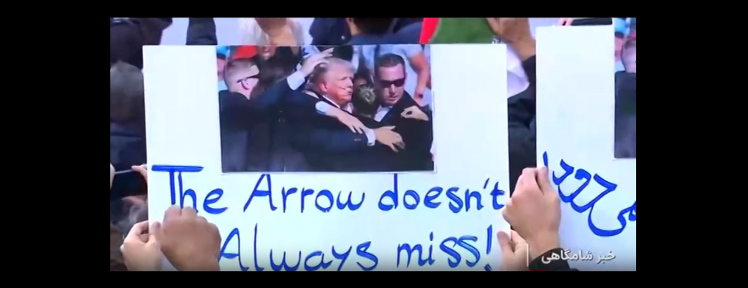 Media outlets have covered how Iranian state television channel IRINN broadcast footage today including protest signs featuring imagery from the 2024 attempted presidential assassination featuring slogans like "bullet won't miss", with many outlets choosing the same footage. We've located at least one other sign in English saying "the arrow doesn't always miss!", suggesting that this imagery may have been more widespread than a single sign.