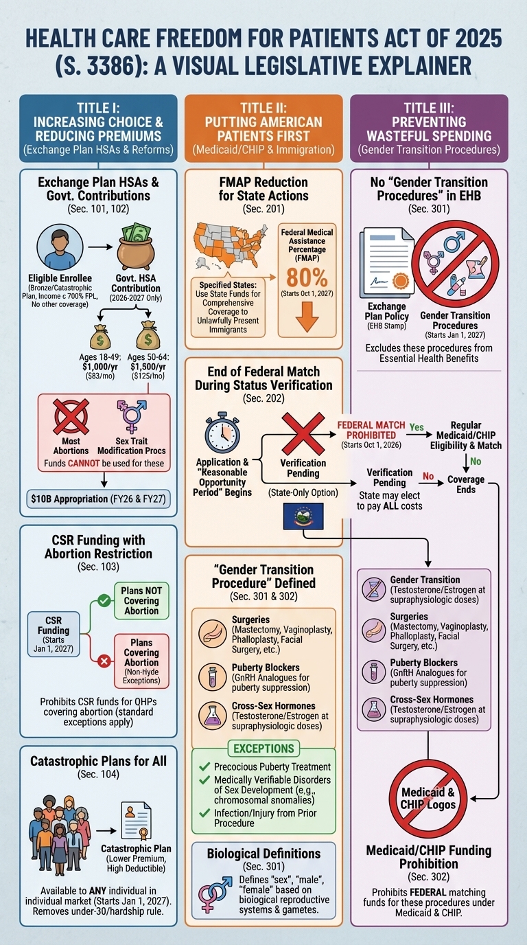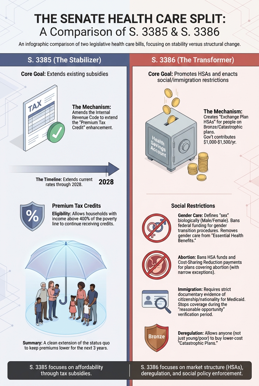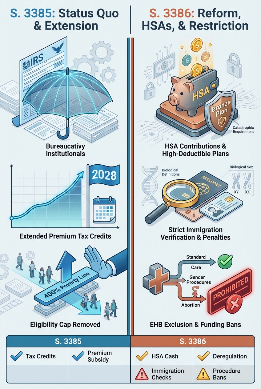 - S. 3386 is a comprehensive reform bill that shifts focus toward consumer-driven healthcare (Health Savings Accounts), deregulation (expanding catastrophic plans), and the implementation of strict social policy restrictions regarding immigration, abortion, and gender transition procedures.