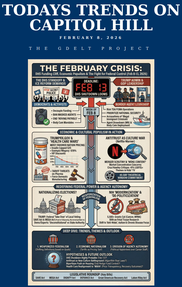 Here we use Gemini 3 Flash and Nano Banana Pro to deeply examine the legislative business of Congress of the past week as covered by CSPAN, CSPAN2 and CSPAN3 to tease out its overarching themes and trends into a richly annotated thematic analysis. Each high-level insight is connected back to the original source material, allowing journalists and scholars to understand the legislative themes and trends and instantly click out to the underlying sources for details as a public interest experiment in applying deep trend analysis to the daily business of the United States Congress to explore how responsibly applied advanced AI can help journalists, scholars and Congressional staff better understand the overarching legislative trends, themes and patterns of Congress.