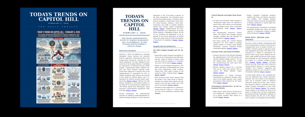 Here we use Gemini 3 Flash and Nano Banana Pro to deeply examine the legislative business of Congress of the past week as covered by CSPAN, CSPAN2 and CSPAN3 to tease out its overarching themes and trends into a richly annotated thematic analysis. Each high-level insight is connected back to the original source material, allowing journalists and scholars to understand the legislative themes and trends and instantly click out to the underlying sources for details as a public interest experiment in applying deep trend analysis to the daily business of the United States Congress to explore how responsibly applied advanced AI can help journalists, scholars and Congressional staff better understand the overarching legislative trends, themes and patterns of Congress.
