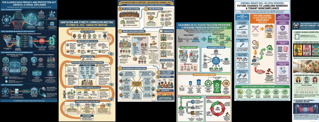 Over the last few days we have demonstrated the incredible potential of translating the legislation, hearings, reports and other output of the US Government into infographics to make the dense and jargon-filled language of governance and democracy accessible to the general public. Could state and local governments use this same model to make their legislation and hearings more accessible to their constituents? Here we transform state-level legislation from California, Illinois and Virginia and local San Francisco government meetings into infographics, demonstrating the immense potential of this work for communicating the functioning of state and local governments.