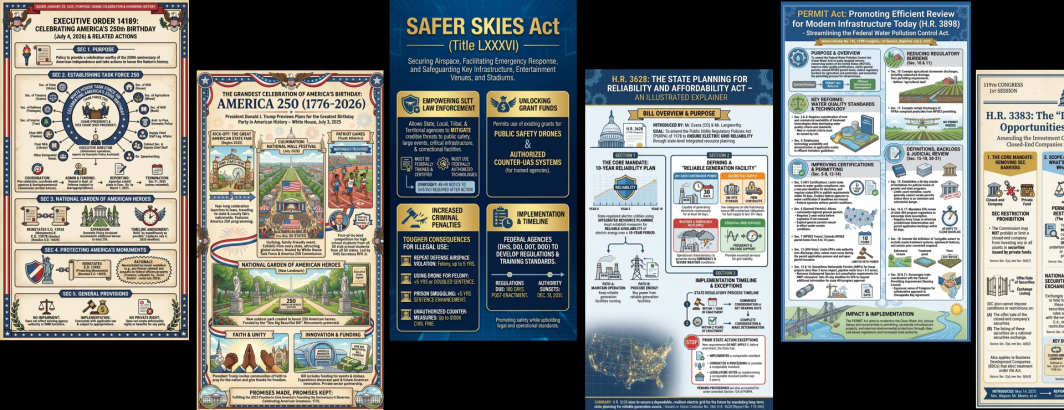 Here we take an assortment of executive orders, fact sheets and proposed and enacted legislation and visualize each through Nano Banana Pro. As a demonstration of what this vision could ultimately look like, we even visualize each of the major pieces of legislation listed on the Bills This Week list as of this morning. For several technically complex pieces of legislation, we explore how Nano Banana Pro can make two versions of the infographic: one that captures the technical specifics of the bill and one that simplifies it for those who don't understand that topic. Finally, we demonstrate coupling Gemini 3 Pro with Nano Banana Pro to visualize the absolutely massive HR1 ("One Big Beautiful Bill Act") to showcase the ability to transform even the largest and most complex pieces of legislation into an easy-to-understand infographic.