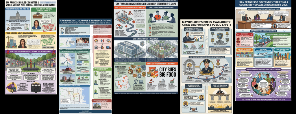 Earlier today we demonstrated transforming several local government meetings broadcast on the San Francisco Government TV (SFGovTV) channel into beautiful easy-to-understand visual infographics. What would it look like to visualize an entire day of San Francisco Government TV broadcasts as infographics to help the city's residents better understand the functioning of their government? The results below showcase the incredible potential of visualizing democracy as infographics. Only the public enterprise Gemini and Nano Banana APIs were used and no data was used to train or tune any model. The results below present the direct output of Nano Banana Pro as-is without any human editing and thus may contain errors.