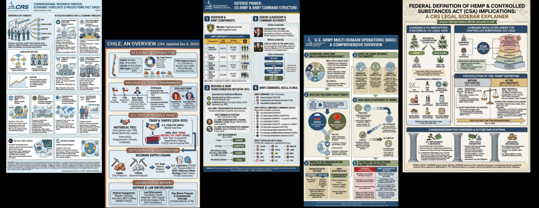 Given our success in turning dense congressional legislation into easy-to-understand infographics using Gemini 3 and Nano Banana Pro, could we do the same for Congressional Research Service (CRS) products? These textual reports are typically a few pages long and offer backgrounders on key topics of interest to Congress. What if we took eight of the reports that CRS released today and used Gemini 3 and Nano Banana Pro to transform all eight into infographics? In each case we simply provided Nano Banana Pro with the original PDF file directly from the CRS website and our standard generation prompt and the results you see below are the actual Nano Banana Pro output as-is without any human editing. There may be errors in the infographics below – they are intended solely as an experiment to explore how such automated image generation tools could be of use in transforming US Government reports into digestible visual forms. Only the public enterprise Gemini and Nano Banana APIs were used and no data was used to train or tune any model.