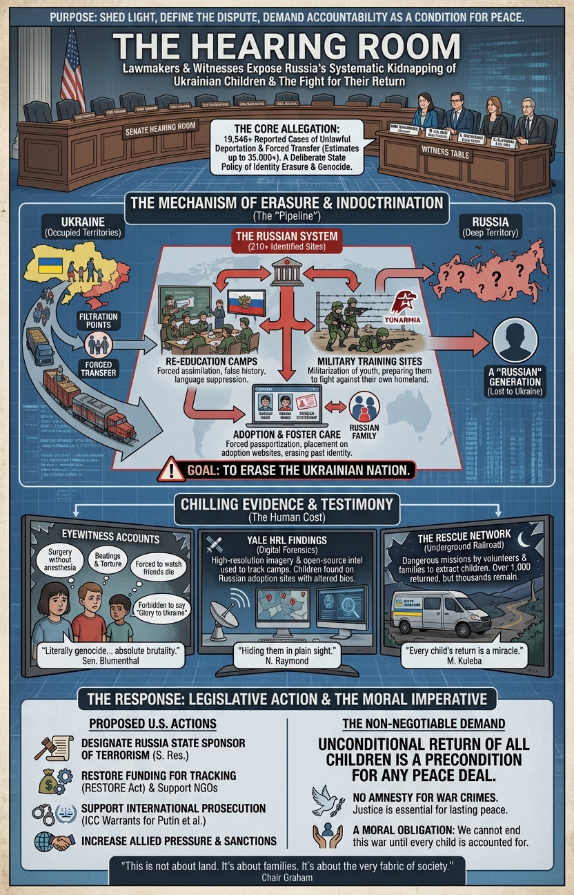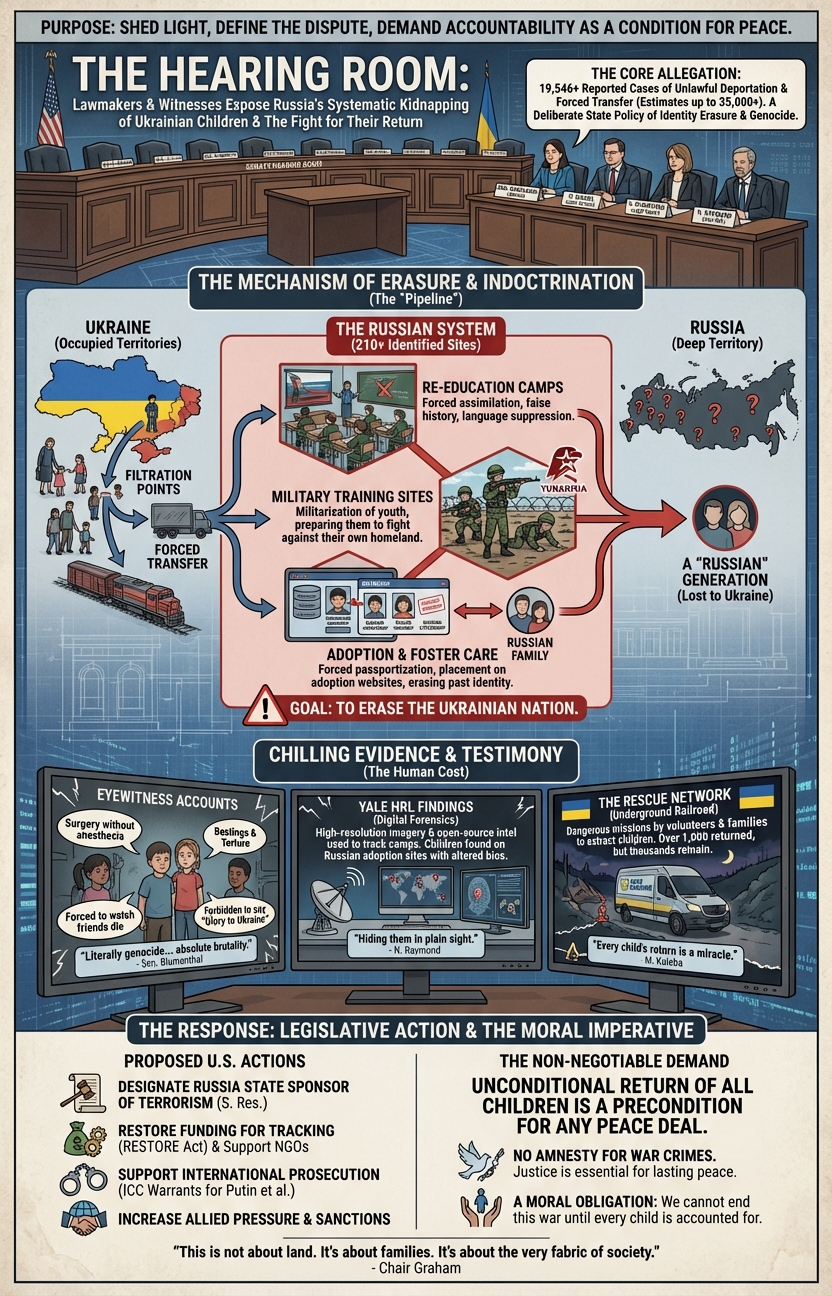 How about a specific hearing "Lawmakers Hear Testimony on Russia's Kidnapping of Ukrainian Children"? Can Nano Banana Pro turn this nearly-two-hour-long hearing into a single infographic that captures its core details? Incredibly, the image below is one of the most powerful and effective infographics we've ever seen on this topic: