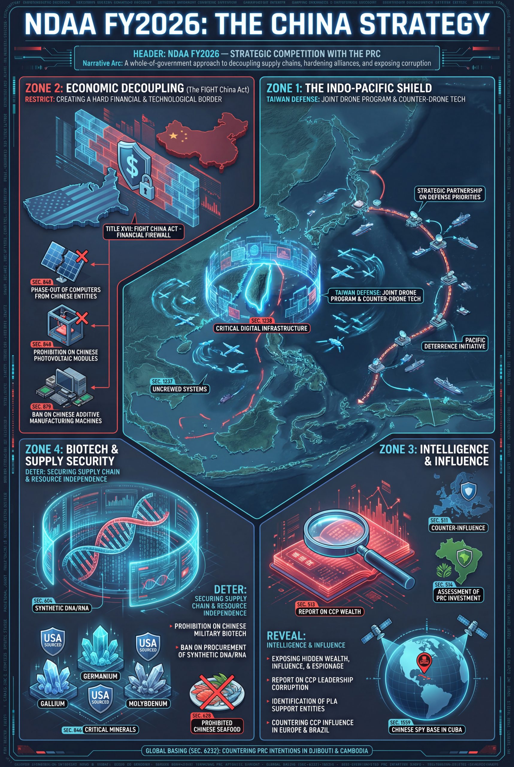 The bill represents a significant escalation in economic and technological warfare against the People’s Republic of China (PRC), most notably through Title XVII, the "FIGHT China Act." This provision establishes a hard firewall against Chinese integration into the U.S. economy by imposing strict sanctions and prohibitions on "Covered National Security Transactions" to cut off U.S. capital to the Chinese military-industrial complex. The report details a comprehensive effort to purge Chinese influence from defense supply chains, mandating the phase-out of Chinese-owned computers and printers (Sec. 879), banning Chinese photovoltaic modules (Sec. 848) and additive manufacturing machines (Sec. 880), and even prohibiting Chinese-sourced seafood in military dining facilities (Sec. 628). Additionally, the Intelligence Authorization (Division F) mandates reports on the personal wealth and corruption of CCP leadership to counter foreign influence. -