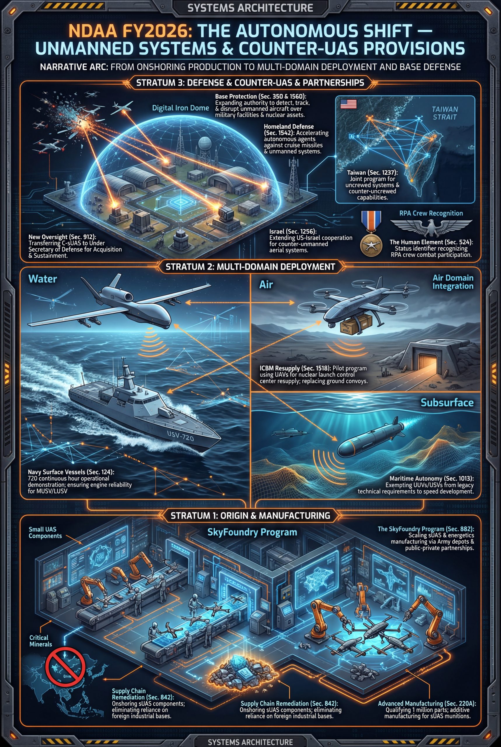 The FY2026 NDAA signals a decisive shift from "just-in-time" acquisition to mass domestic production of unmanned systems. The legislation prioritizes decoupling the small UAS (sUAS) supply chain from China, integrating drones into logistics and strategic deterrence missions, and centralizing the oversight of Counter-UAS (C-UAS) capabilities.