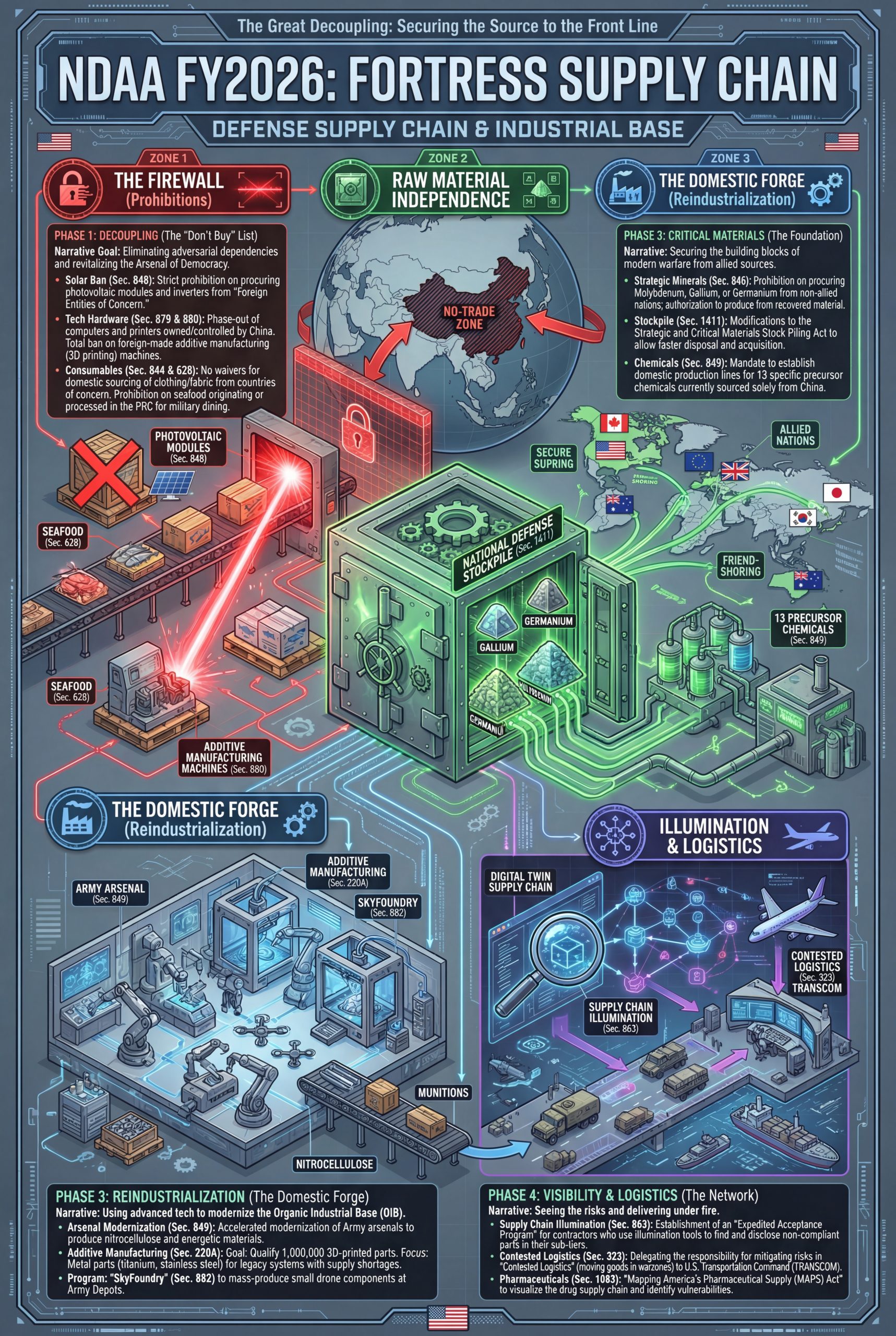 The report outlines a transition from a globalized "just-in-time" supply chain to a "just-in-case" domestic arsenal. It establishes the "SkyFoundry Program" (Sec. 882) to mass-produce small drones and energetics using Army depots and public-private partnerships. The bill places heavy emphasis on "onshoring" critical inputs, prohibiting the procurement of strategic minerals like gallium, germanium, and molybdenum from non-allied nations (Sec. 846) and accelerating the modernization of Army arsenals to produce essential chemicals like nitrocellulose domestically (Sec. 849). It also introduces "Supply Chain Illumination" programs (Sec. 863) to force contractors to expose and remediate vulnerabilities deep within their sub-tier supply networks. -