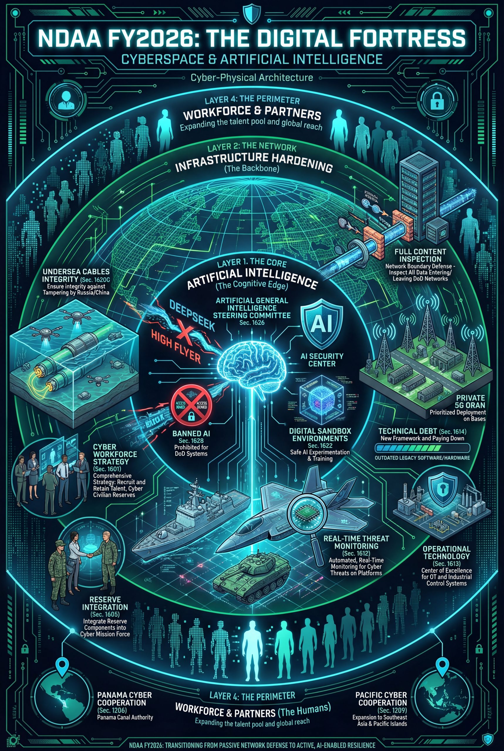 Model Security: Section 1627 mandates a new cybersecurity framework specifically for "highly capable" AI. This includes securing the "model weights" (the mathematical parameters that define the AI's behavior) against theft and preventing "data poisoning" attacks.