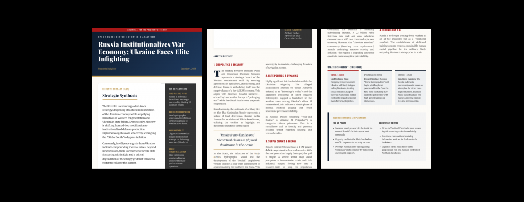 I have a prompt to make a presidential daily brief intelligence report. One of the sections is an analytic deep dive, seen below. The current one is too specific to one country. Make it more generalized to fit all countries. Also add in all additional sections you think would be useful, such as economy, supply chains, infrastructure, tech, health, regulation, ai, etc. ANALYTIC DEEP DIVE (Thematic Synthesis) Do not organize chronologically. Organize by these strategic themes (add additional strategic themes that you see well-represented in the broadcast transcripts): Geopolitics & Defense: Alliances, military pivots, foreign visits (e.g., Russia/China vs. Western alignment). Domestic Stability & Governance: Disaster response, infrastructure failures, industrial safety, and public unrest. Connect these to state capacity. Elite Politics & Internal Fractures: Leadership struggles within religious groups (e.g., NU/Muhammadiyah), parties, or the cabinet. Economic Statecraft: Analyze economic news through a political lens (e.g., resource nationalism, export bans, tax policy as populist tools).