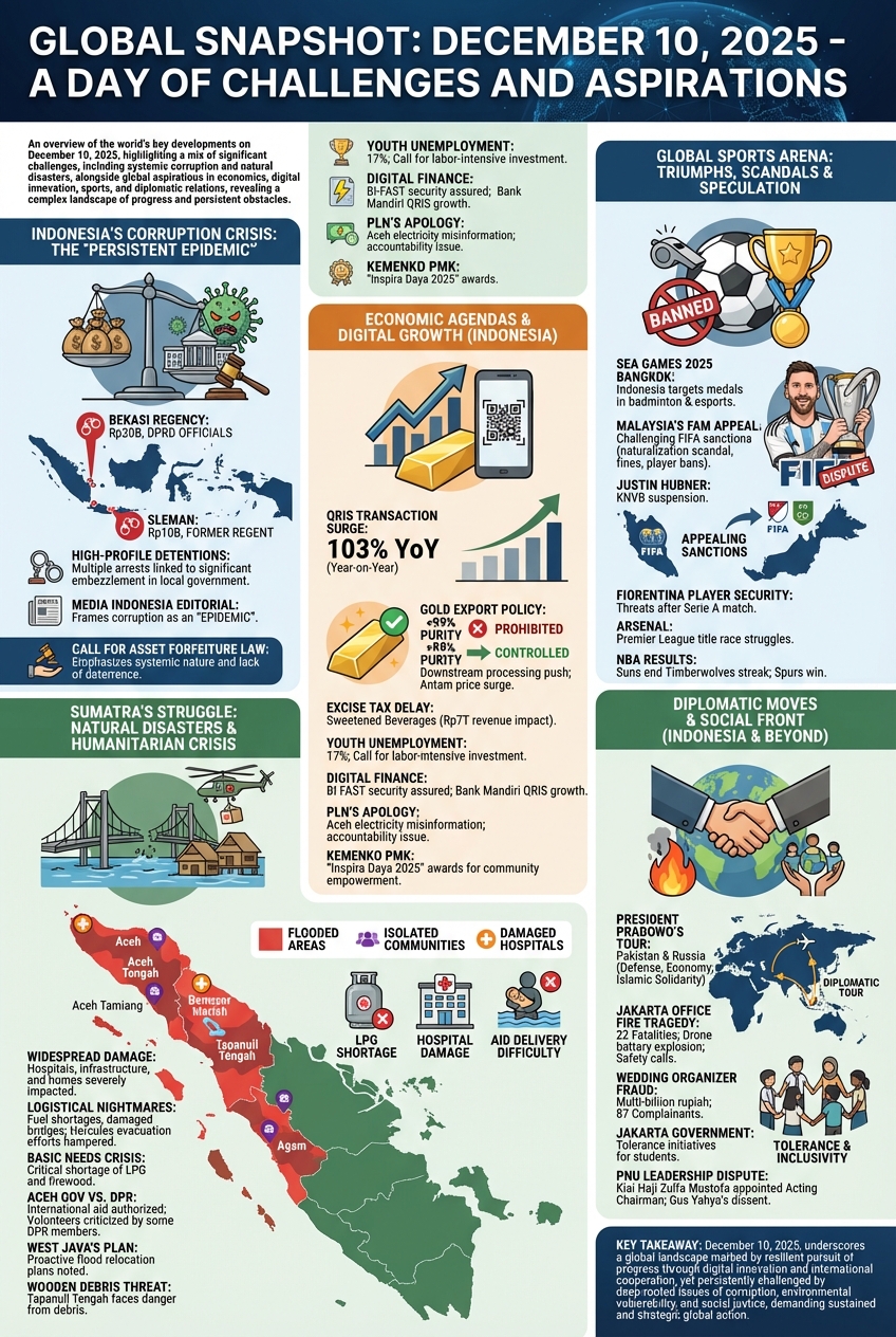 The confluence of events on December 10, 2025, paints a picture of a nation at a crossroads. The immediate future will be dominated by the ongoing disaster recovery efforts in Sumatra. The government's capacity to deliver effective and transparent aid, restore critical infrastructure, and address the root causes of environmental degradation (like illegal logging) will be a significant test of its legitimacy and competence. Failure to do so risks exacerbating social unrest, health crises, and economic hardship in affected regions. The Aceh Selatan Bupati's case, in particular, will serve as a critical precedent for accountability in local governance during crises.