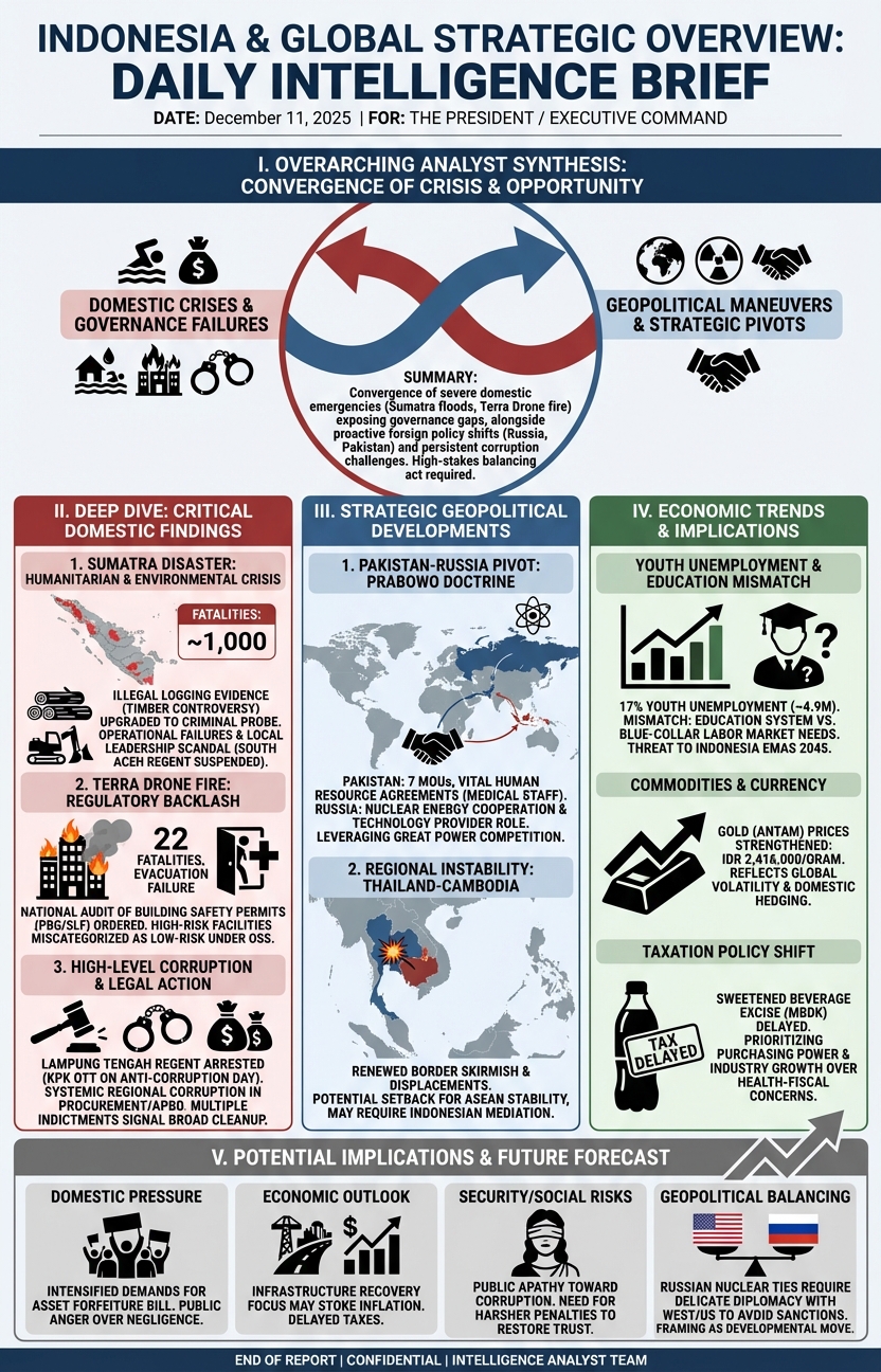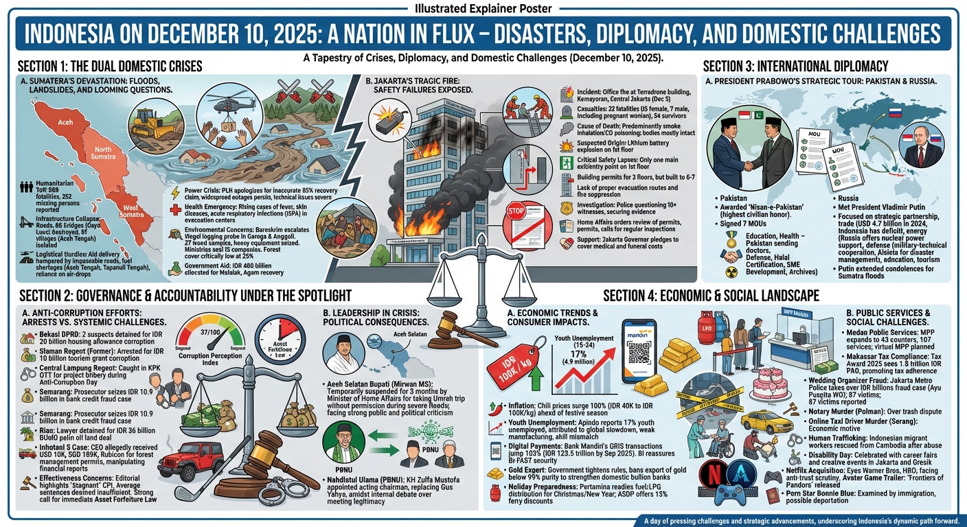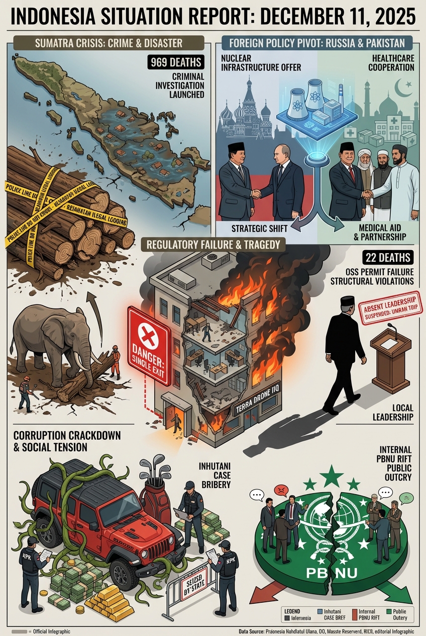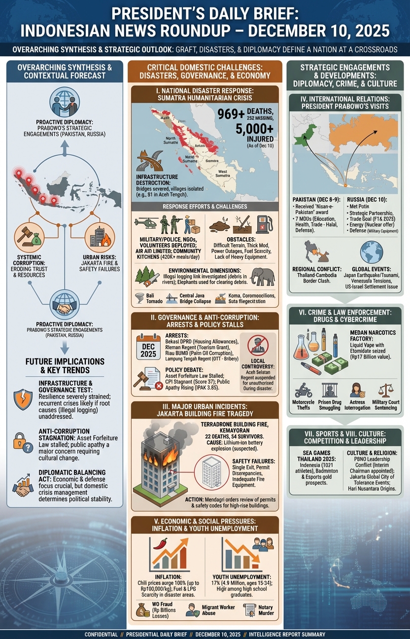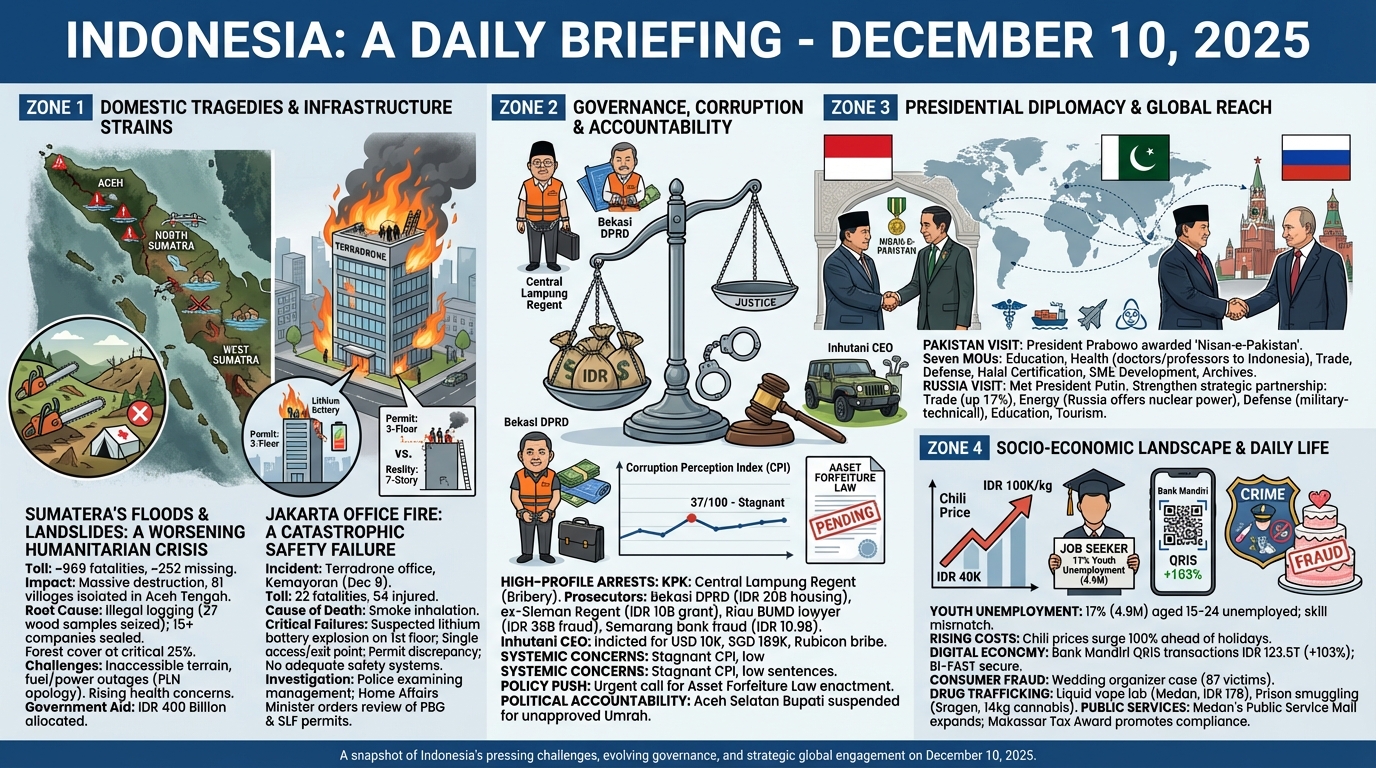 Overview: Today's news cycle was dominated by a series of critical domestic events, notably the ongoing humanitarian crisis in Sumatera due to widespread floods and landslides, and a tragic office building fire in Jakarta. These events highlighted significant challenges in disaster response, infrastructure resilience, and building safety standards. Concurrently, high-level diplomatic efforts by President Prabowo Subianto focused on strengthening strategic partnerships and economic ties abroad, while domestic governance faced scrutiny over corruption and political accountability.
