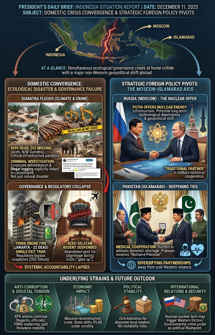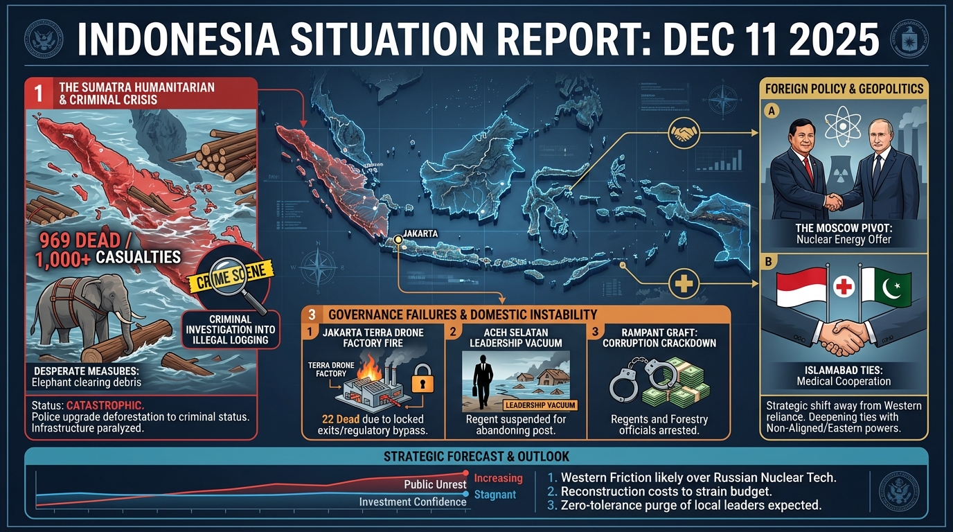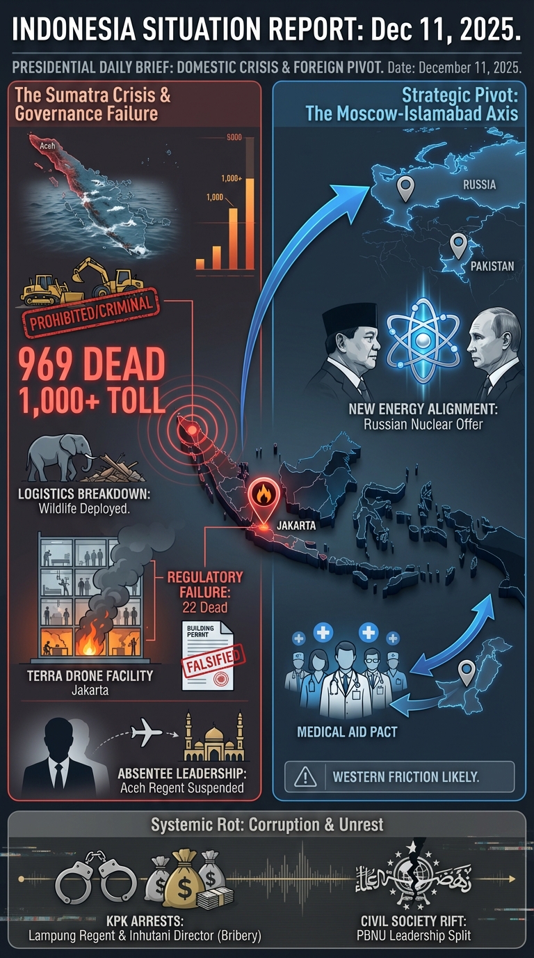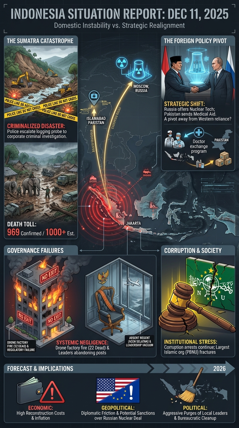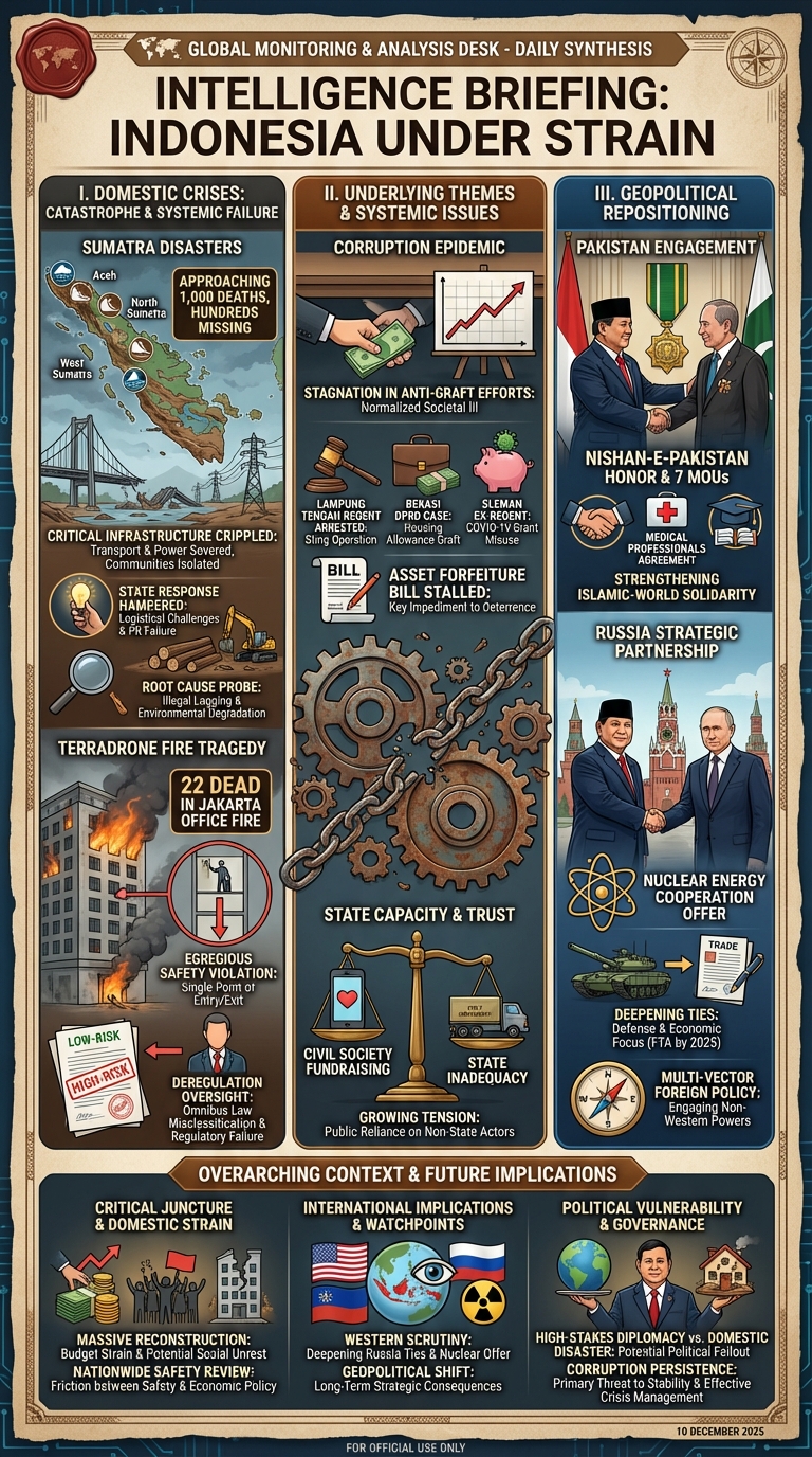 Indonesia is currently grappling with a severe domestic crisis characterized by mass-casualty events, systemic governance failures, and a multi-province natural disaster. While President Prabowo Subianto pursues strategic diplomatic and energy gains in Pakistan and Russia, the domestic landscape is dominated by the aftermath of a fatal industrial fire in Jakarta and a flood catastrophe in Sumatra that has claimed nearly 1,000 lives. These events have exposed critical vulnerabilities in building safety regulations, disaster response, and regional leadership integrity.