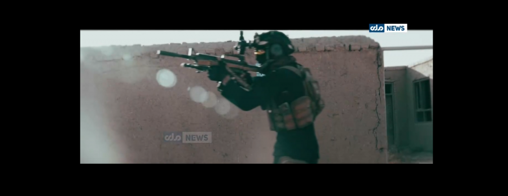 While much of Afghanistan's RTA television channel airtime covers more mundane Taliban topics, there are an interesting number of highly stylized promotional military clips depicting a mix of troops and highly armed elite soldiers storming buildings, firing weapons, driving around in trucks and similar kinds of imagery, often set to music, such as this clip or this montage. It is interesting to see that despite regaining control of the country, the Taliban continue to emphasize patriotic military force in slickly produced clips like these on national television.