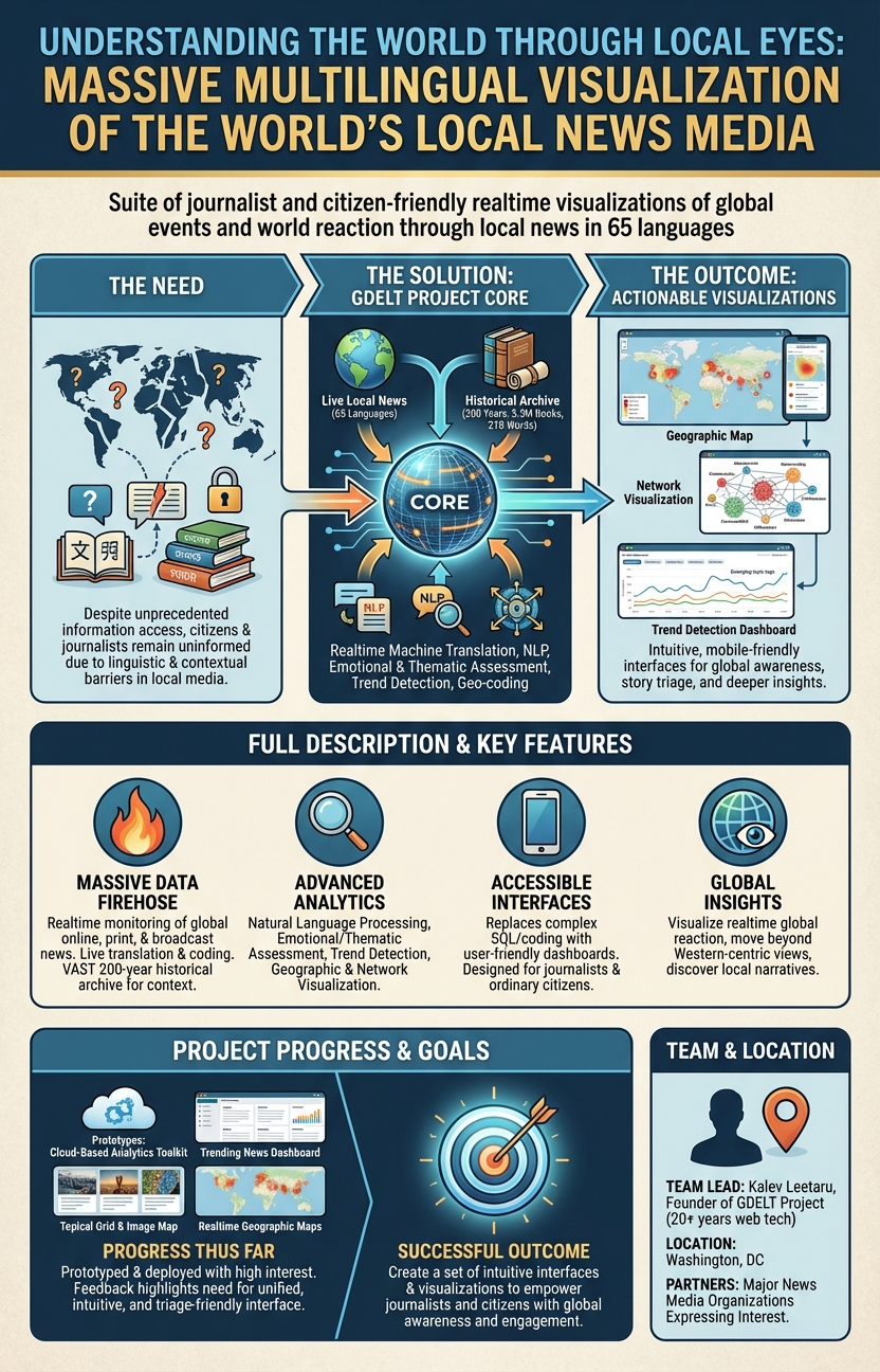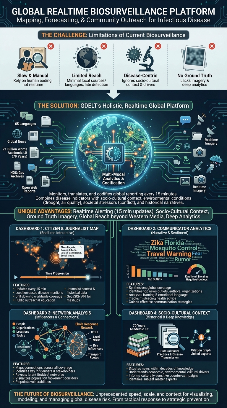 Just under a decade ago we submitted a proposal to US public health authorities to create "A Realtime Global Biosurveillance Platform for Mapping, Forecasting, Network Assessment and Community Outreach for Infectious Disease." Unfortunately, that proposed biosurveillance platform was ultimately dismissed by US Government reviewers who argued that focusing exclusively on a small number of Western English language sources, human-driven legacy tools and Twitter scraping was all that was needed to forecast every future disease outbreak. Ironically, just a few years later GDELT was used with the exact model we proposed to provide one of the earliest alerts of the impending COVID19 outbreak. All of our infographic experiments over the past week got us thinking, what would it look like to visualize a highly technical proposal like this and transform it into something visually compelling and instantly understandable that might have helped us sway those reviewers? The results of this initial test were so stunning that we started asking what would it look like to go back and make infographics for a number of proposals we've submitted to various organizations over the years. Below you can see Nano Banana Pro's infographic visualization of four different proposals from over the years, showcasing just how stunningly it can transform even the most dense and technical of proposals into beautiful and incredibly compelling visual representations simply by drag-dropping a PDF of our proposal and the prompt below.