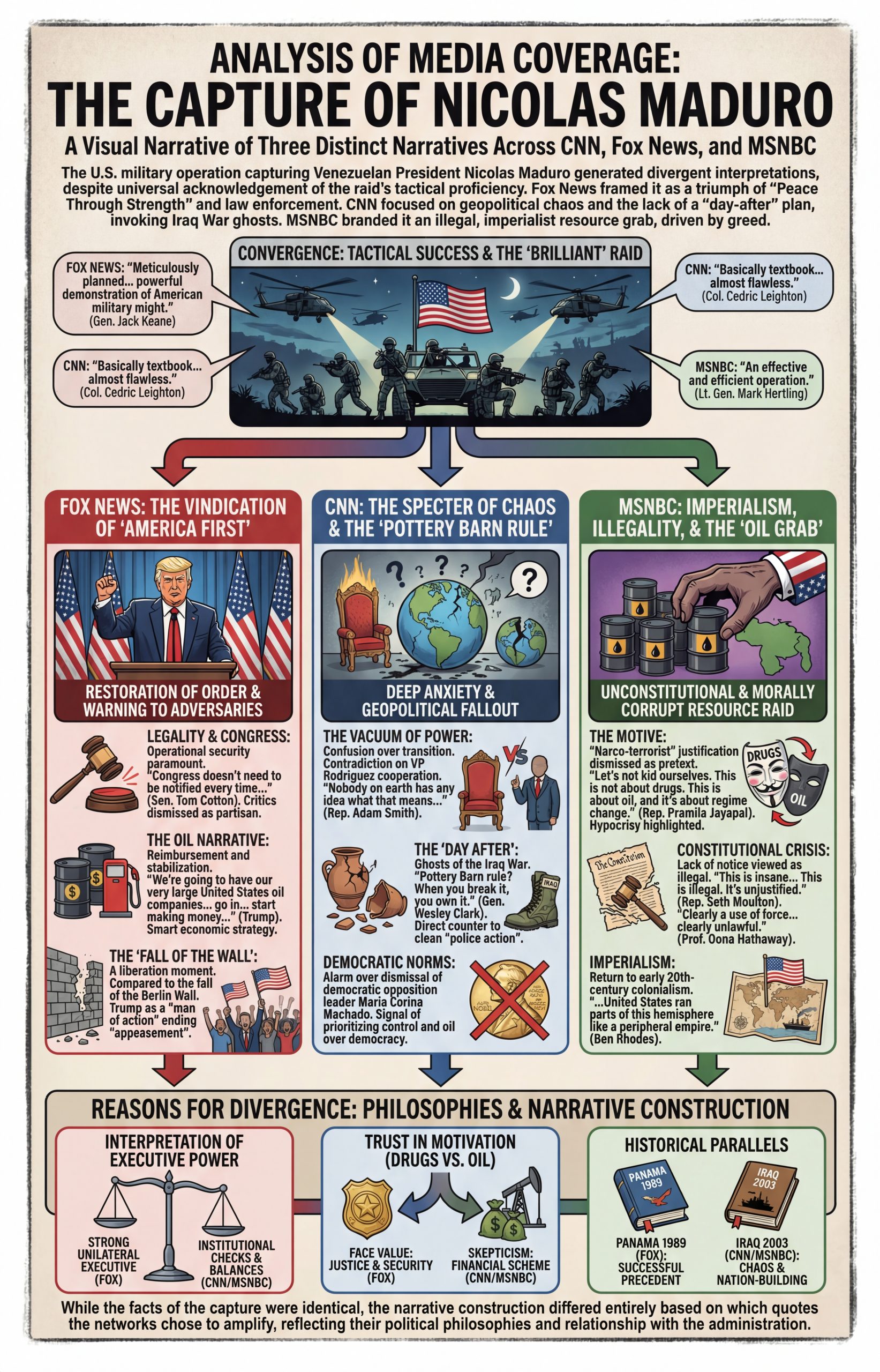 In summary, while the facts of the capture were reported identically, the narrative construction differed entirely based on which quotes the networks chose to amplify. Fox amplified Trump’s quotes about "justice" and "strength," portraying a restoration of order. CNN amplified Trump's quotes about "running the country," portraying a plunge into dangerous uncertainty. MSNBC amplified Trump's quotes about "taking the oil," portraying a crime against international law.