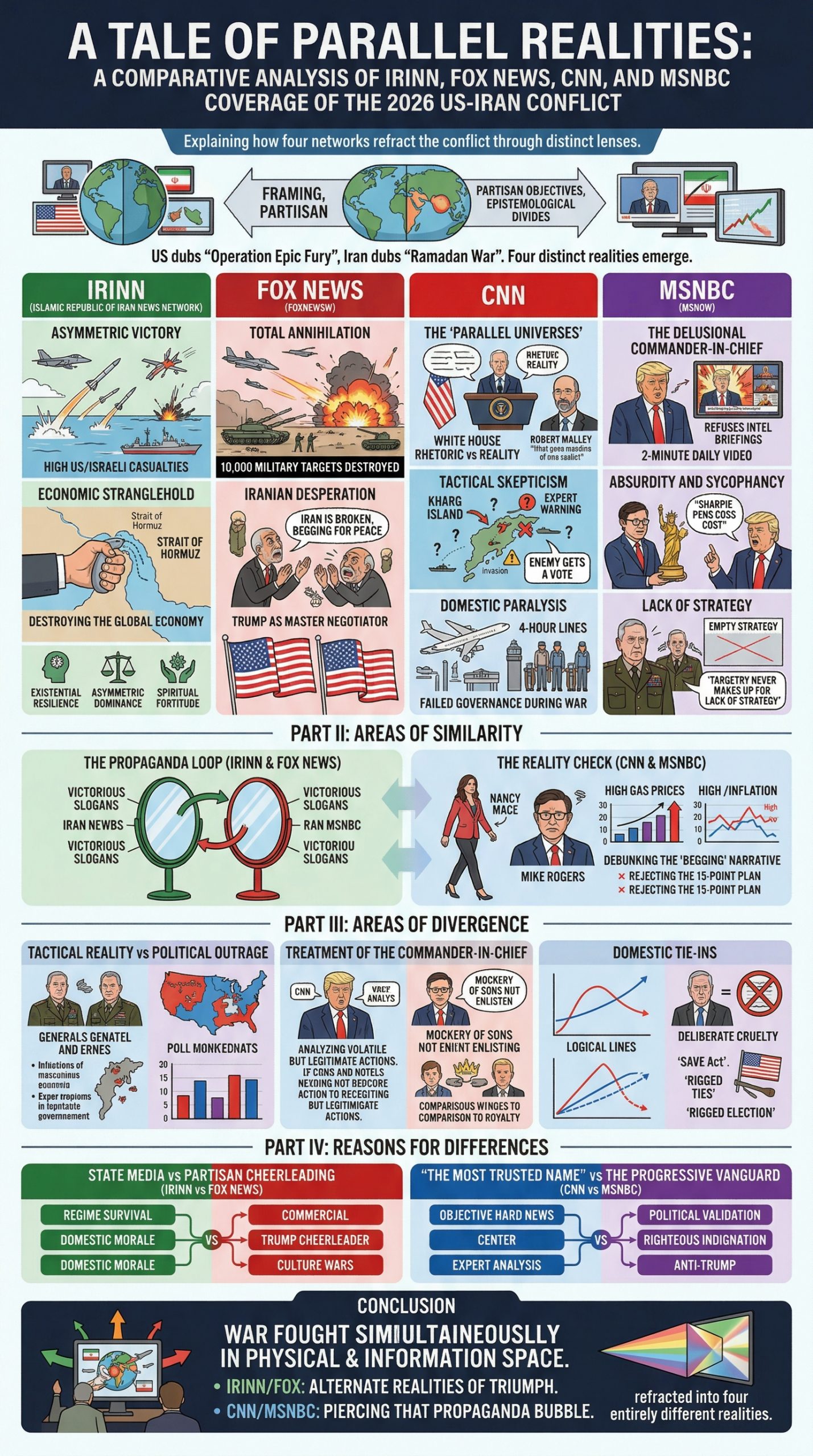 The coverage of the 2026 Iran conflict illustrates how modern warfare is fought simultaneously in the physical domain and the information space. IRINN and Fox News provide their audiences with alternate realities of glorious, unmitigated triumph. In contrast, CNN and MSNBC attempt to pierce that propaganda bubble. However, they do so through entirely different lenses: CNN through the cold, hard metrics of global logistics and military strategy, and MSNBC through the fiery lens of political outrage and democratic institutional decay. To watch all four networks is to see the exact same war refracted into four entirely different realities.