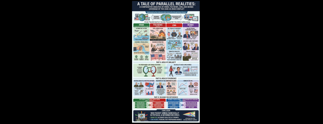 The coverage of the 2026 Iran conflict illustrates how modern warfare is fought simultaneously in the physical domain and the information space. IRINN and Fox News provide their audiences with alternate realities of glorious, unmitigated triumph. In contrast, CNN and MSNBC attempt to pierce that propaganda bubble. However, they do so through entirely different lenses: CNN through the cold, hard metrics of global logistics and military strategy, and MSNBC through the fiery lens of political outrage and democratic institutional decay. To watch all four networks is to see the exact same war refracted into four entirely different realities.