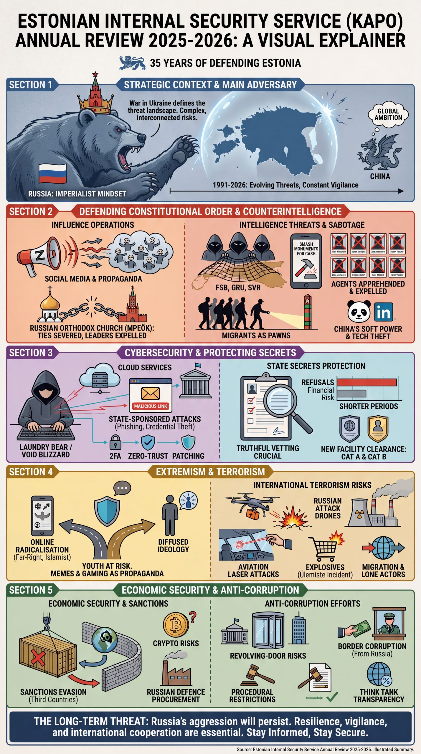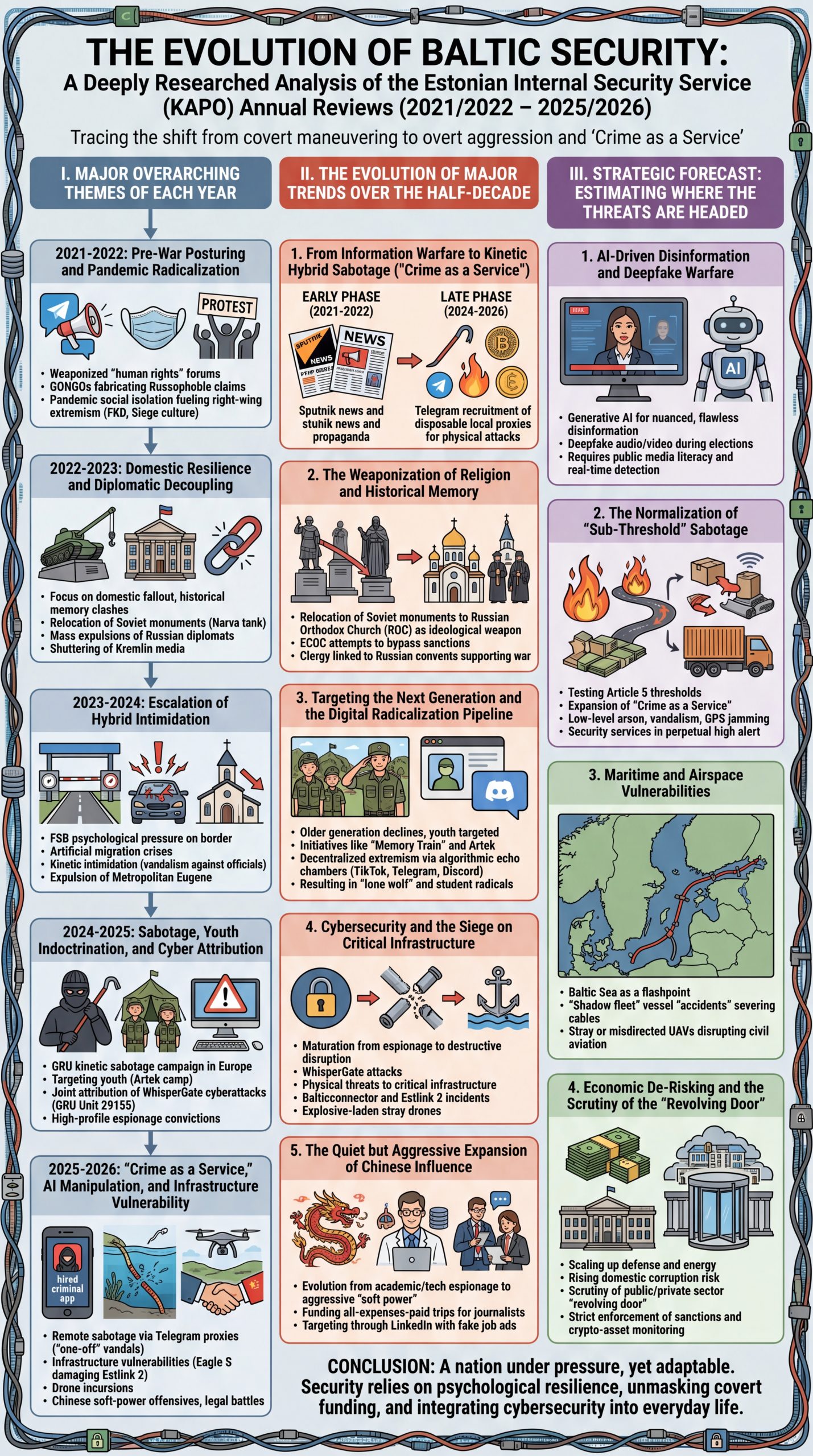 The half-decade captured in these KAPO reviews tells the story of a nation under immense pressure, yet highly adaptable. The primary adversary—Russia—has been degraded diplomatically and economically, but has responded like a cornered predator, resorting to sabotage, youth manipulation, and cyber destruction. Moving forward, Estonia’s security will rely not just on military deterrence, but on the psychological resilience of its population, the unmasking of covert funding streams, and the flawless integration of cybersecurity into the fabric of everyday civic life.