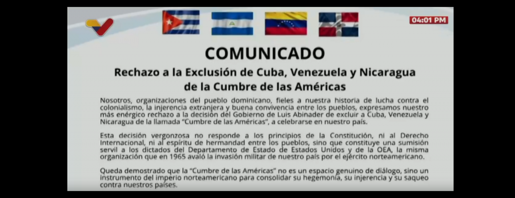 We, organizations of the Dominican people, faithful to our history of struggle against colonialism, foreign interference, and good coexistence among peoples, express our strongest rejection of the decision by the government of Luis Abinader to exclude Cuba, Venezuela, and Nicaragua from the so-called “Summit of the Americas,” to be held in our country.