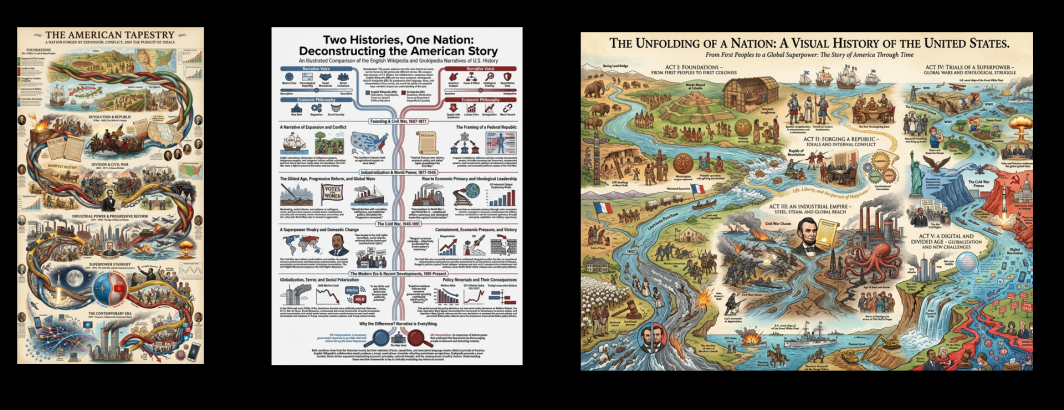 - "This poster explores how the same historical events can be framed to tell profoundly different stories. We compare two accounts of U.S. History: the collaborative, consensus-driven English Wikipedia (EW) and the more analytical, ideologically distinct Grokipedia (GK). By juxtaposing their language, focus, and interpretation of key events, we reveal the subtle but powerful ways narrative shapes our understanding of the past."