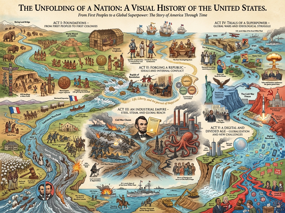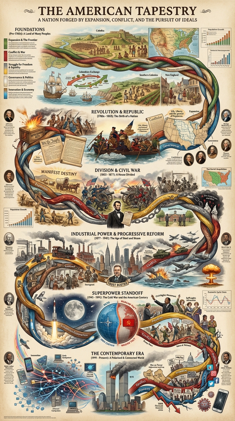 - Focus: Emphasize the Iroquois Confederacy's influence, the framing of a republic with "enumerated powers," and the Civil War as a conflict over "internal fissures" (slavery, economic policy, states' rights). Use more quantitative data (casualty counts, economic output).