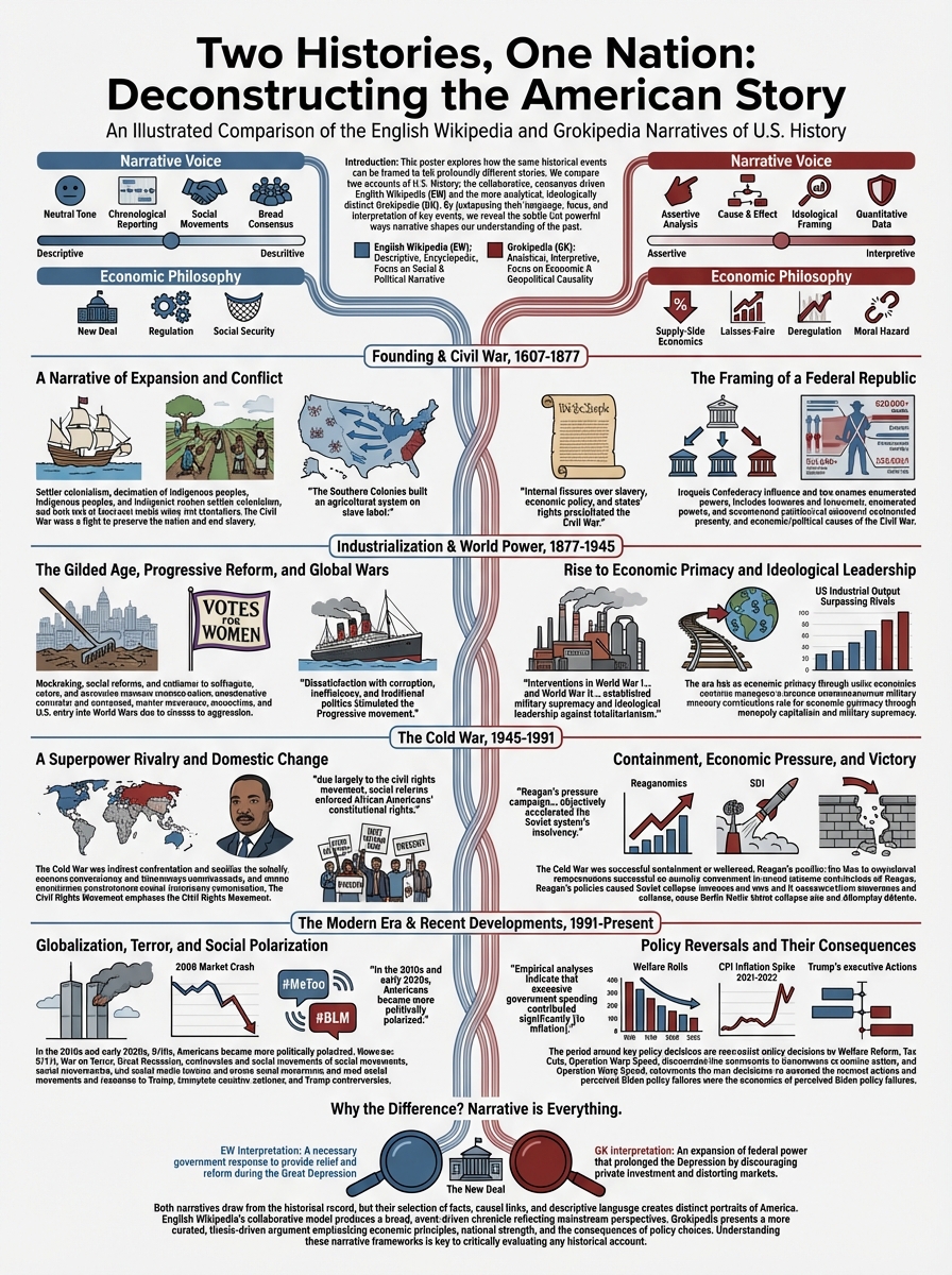 - Concluding Text: "Both narratives draw from the historical record, but their selection of facts, causal links, and descriptive language creates distinct portraits of America. English Wikipedia's collaborative model produces a broad, event-driven chronicle reflecting mainstream perspectives. Grokipedia presents a more curated, thesis-driven argument emphasizing economic principles, national strength, and the consequences of policy choices. Understanding these narrative frameworks is key to critically evaluating any historical account."