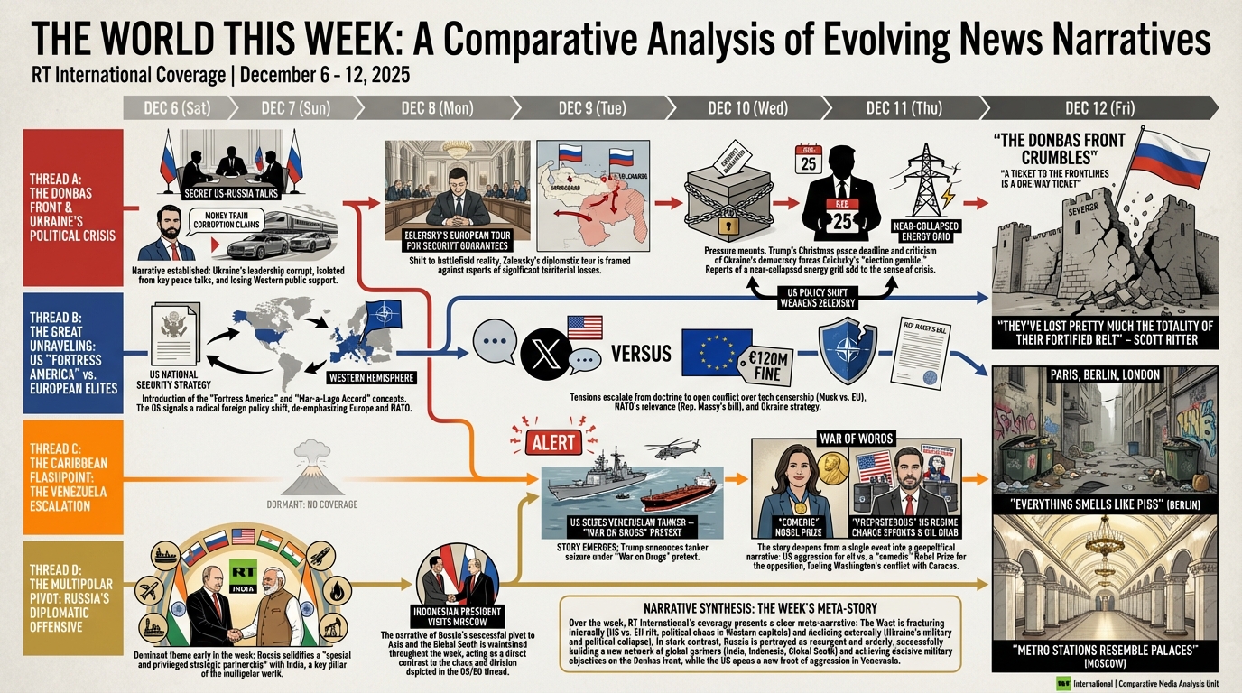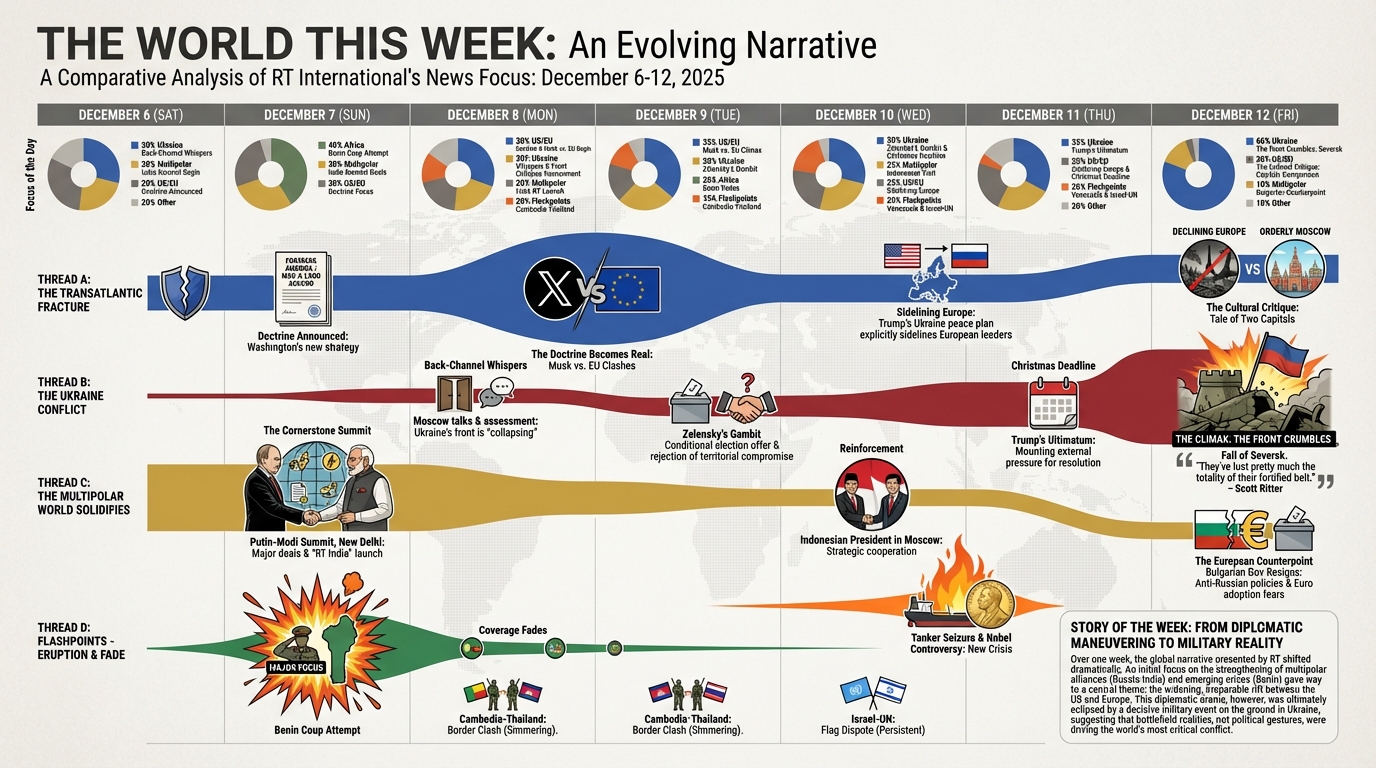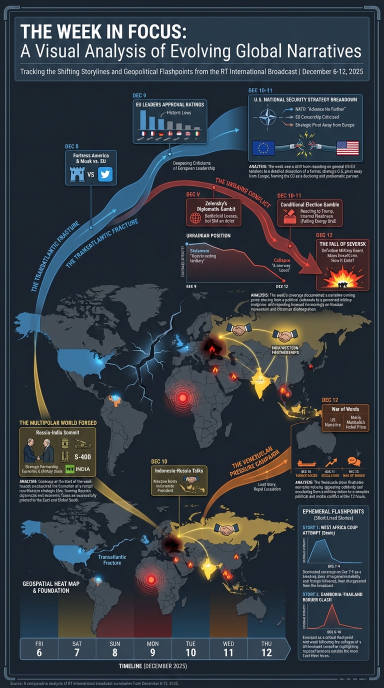 Yesterday we visualized one day in the life of more than 47 global television news channels using Gemini 3 Pro and Nano Banana Pro, while the day before we explored one day of six Russian television news channels, along with a variety of comparative analyses. What about the inverse? What would it look like to visualize one channel over multiple days? Here we use Gemini 3 Pro and Nano Banana Pro to create infographics representing the complete coverage of Russia Today (RT) from December 6-12, 2025, with an infographic visualizing each day's coverage and a series of infographics attempting to visualize the entire week as a single infographic, along with multiple analysis visualizations exploring Gemini-powered deep comparative media analytics to understand how RT's coverage changed throughout the week and how its storylines evolved and why.