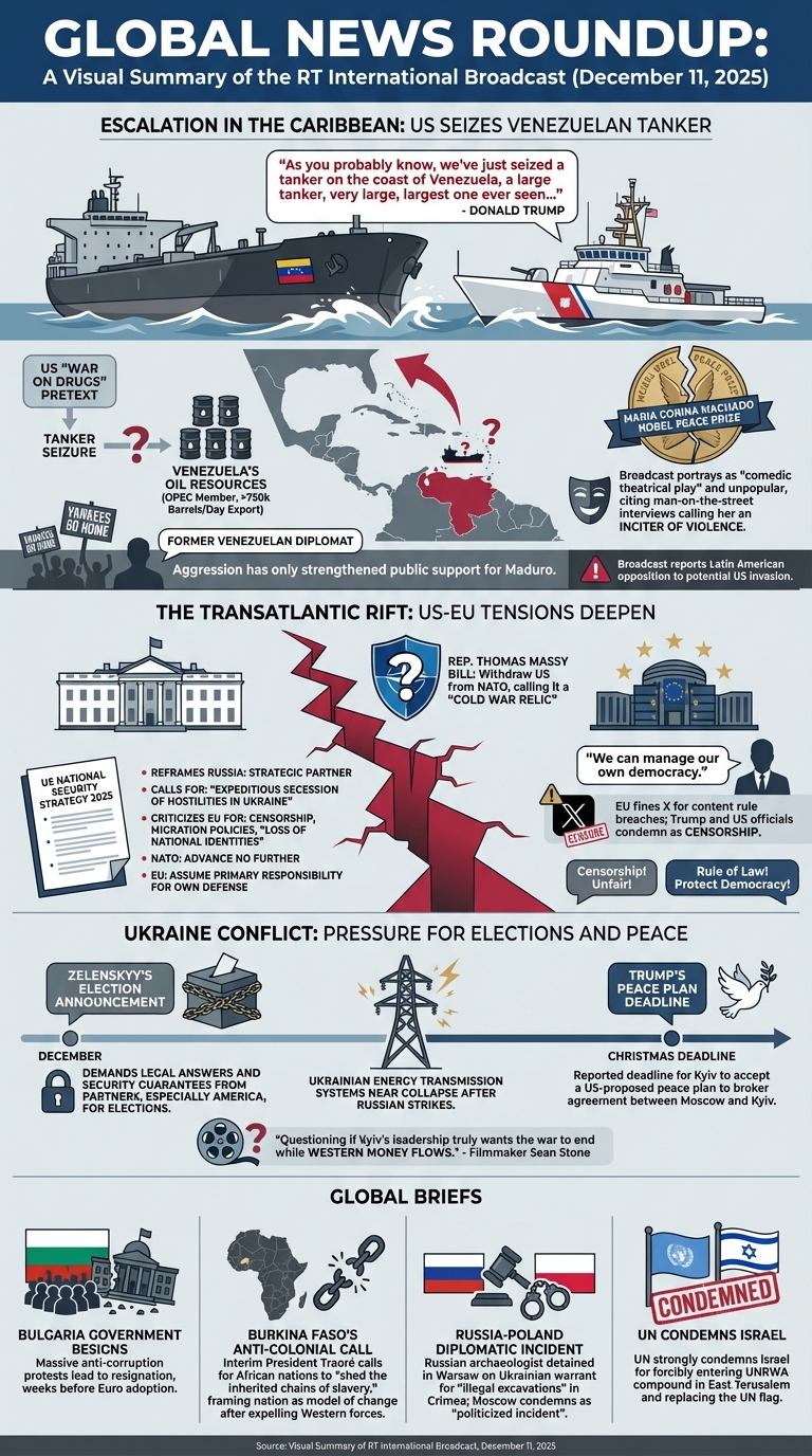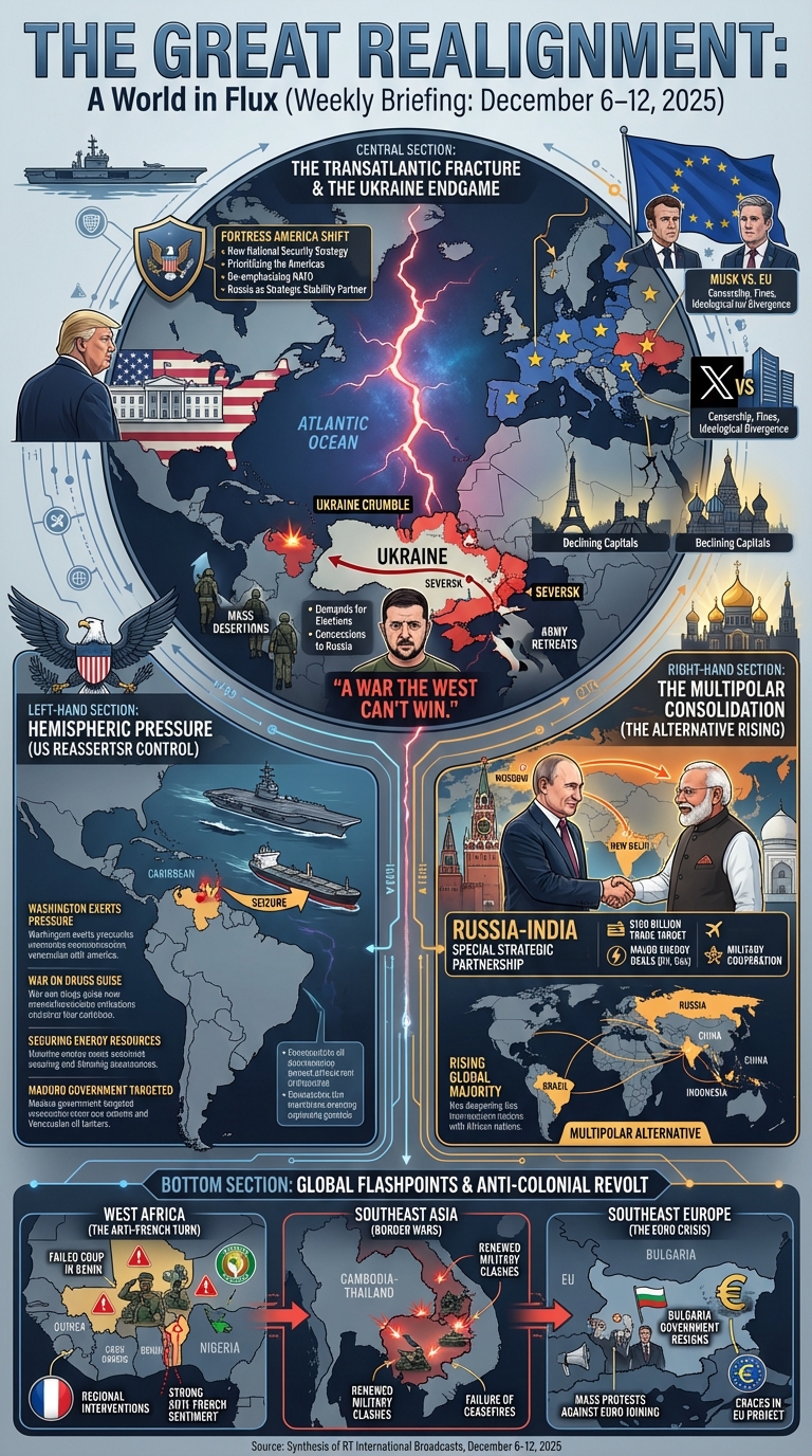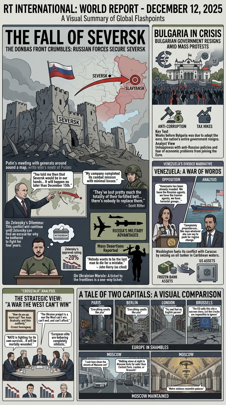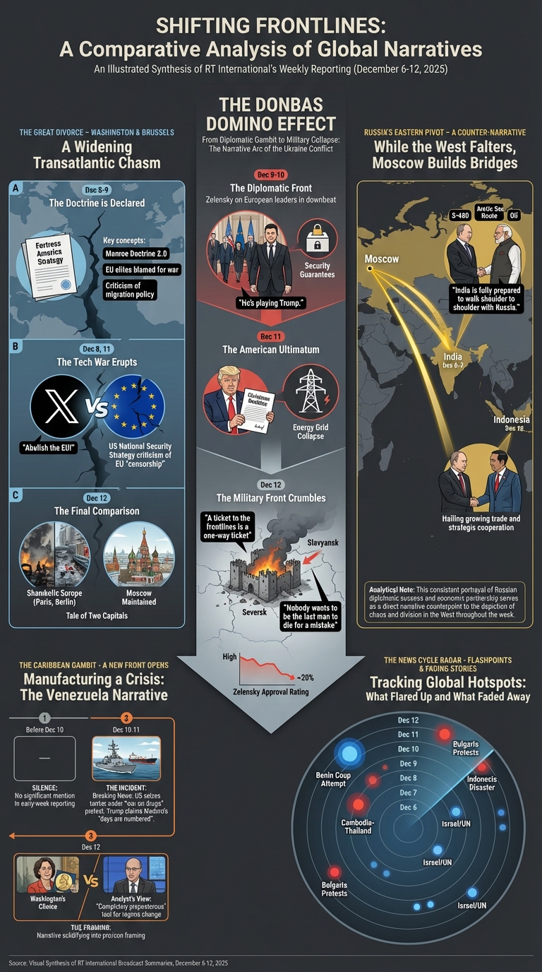 Yesterday we visualized one day in the life of more than 47 global television news channels using Gemini 3 Pro and Nano Banana Pro, while the day before we explored one day of six Russian television news channels, along with a variety of comparative analyses. What about the inverse? What would it look like to visualize one channel over multiple days? Here we use Gemini 3 Pro and Nano Banana Pro to create infographics representing the complete coverage of Russia Today (RT) from December 6-12, 2025, with an infographic visualizing each day's coverage and a series of infographics attempting to visualize the entire week as a single infographic, along with multiple analysis visualizations exploring Gemini-powered deep comparative media analytics to understand how RT's coverage changed throughout the week and how its storylines evolved and why.