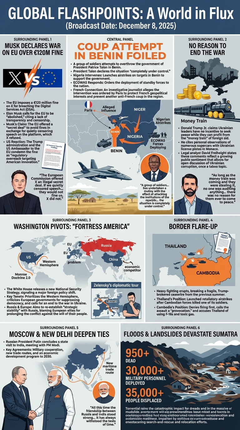 Create a prompt for a large illustrated explainer poster designed to be printed on a large-format poster printer and hung up on the wall that narrates the attached per-day posters as a single large poster that can be printed and hung on a wall that outlines all of the core details. Focus on the combined story of the world told through all of them. Only cover news-related portions of the broadcast, ignore advertisements, sports and entertainment. The poster should be entirely in English.