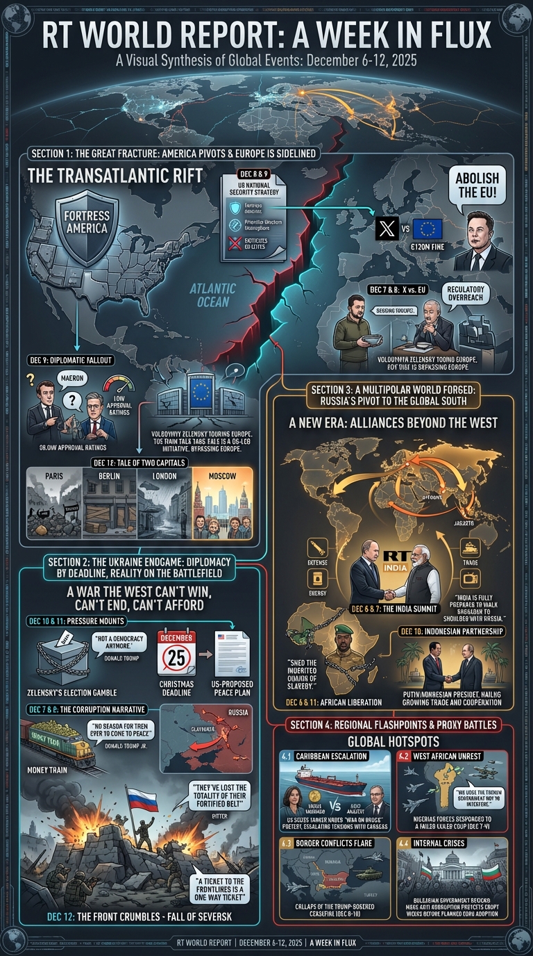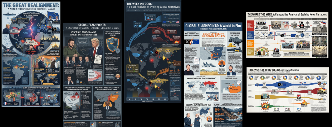 Yesterday we visualized one day in the life of more than 47 global television news channels using Gemini 3 Pro and Nano Banana Pro, while the day before we explored one day of six Russian television news channels, along with a variety of comparative analyses. What about the inverse? What would it look like to visualize one channel over multiple days? Here we use Gemini 3 Pro and Nano Banana Pro to create infographics representing the complete coverage of Russia Today (RT) from December 6-12, 2025, with an infographic visualizing each day's coverage and a series of infographics attempting to visualize the entire week as a single infographic, along with multiple analysis visualizations exploring Gemini-powered deep comparative media analytics to understand how RT's coverage changed throughout the week and how its storylines evolved and why.