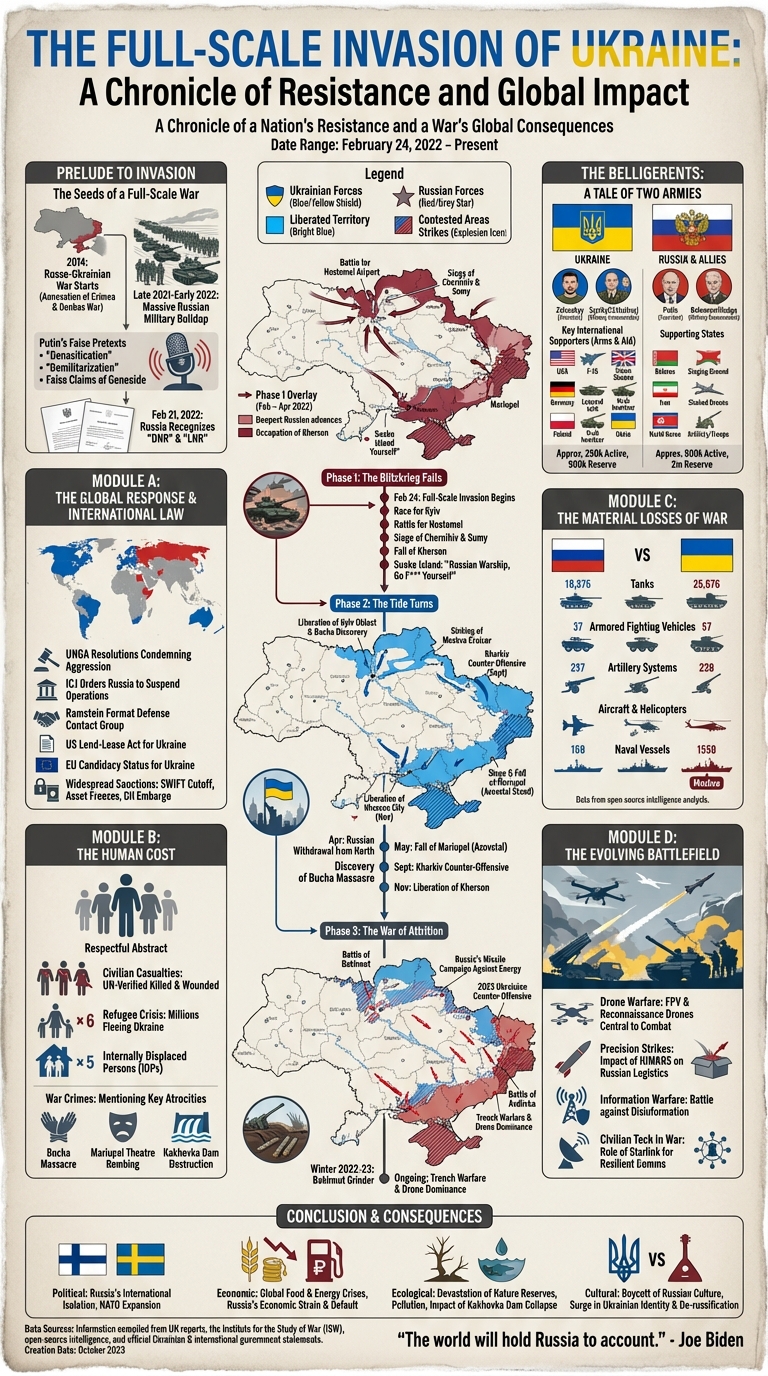 - Central Visual Element: A stylized, simplified map of Ukraine showing the 2022 invasion vectors (North, East, South). This map acts as a neutral anchor for the entire poster.