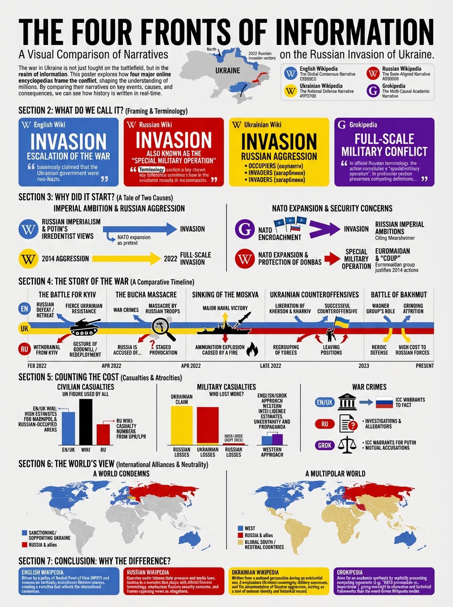 Create a single, large-format illustrated explainer poster (approx. 36" x 48" or A0 size) designed to be printed and hung on a wall. The poster will visually narrate and compare the key differences in how the 2022 Russian invasion of Ukraine is reported and framed by four distinct sources: English Wikipedia, Russian Wikipedia, Ukrainian Wikipedia, and Grokipedia.