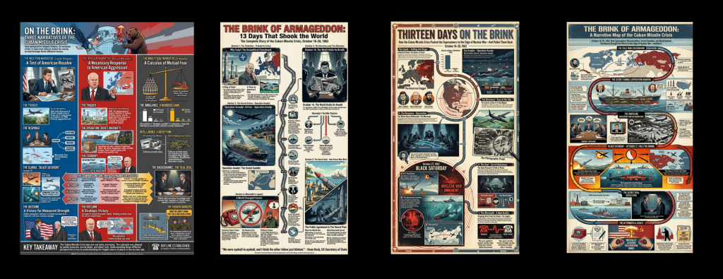 Just how different are the narratives of the Cuban Missile Crisis as told through the English edition of Wikipedia, the Russian edition and Grokipedia? Here we use Gemini 3 Pro and Nano Banana Pro to distill the event down into three infographics (one per article) and then a comparative infographic and textual report outlining the major differences in their underlying narratives. Such visuals offer a powerful reminder of just how differently the same event can be seen and narrated across countries and platforms.